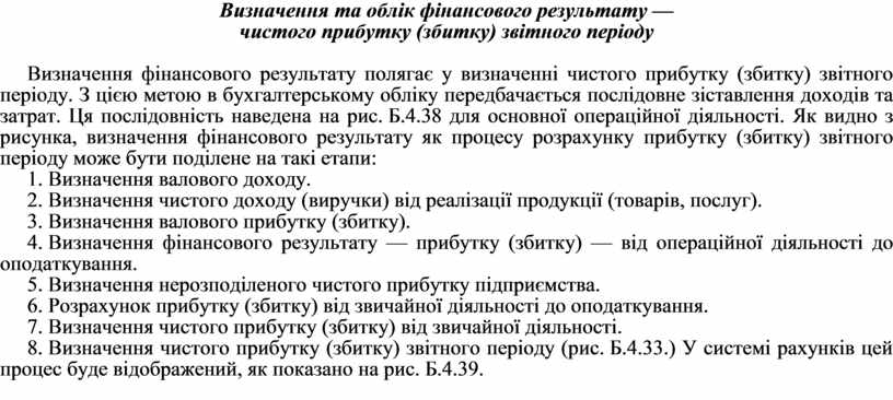 Визначення фінансового результату полягає у визначенні чистого прибутку (збитку) звітного періоду. З цією метою в бухгалтерському обліку передбачається послідовне зіставлення доходів та затрат. Ця послідовність наведена на рис. Б.4.38 для основної операційної діяльності. Як видно з рисунка, визначення фінансового результату як процесу розрахунку прибутку (збитку) звітного періоду може бути поділене на такі етапи: