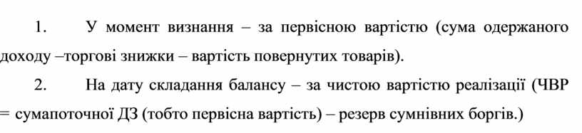 1. У момент визнання – за первісною вартістю (сума одержаного доходу – торгові знижки – вартість повернутих товарів).