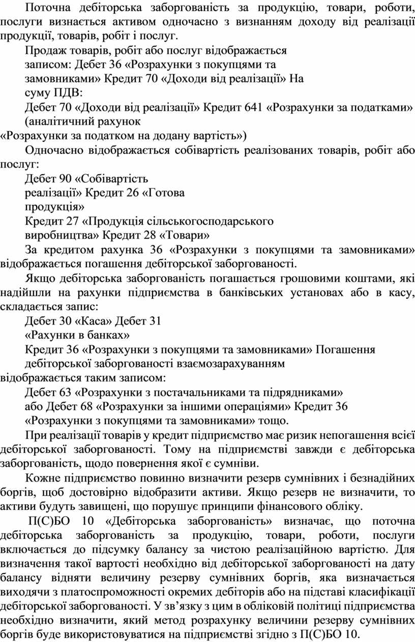 П(С)БО 10 «Дебіторська заборгованість» визначає, що поточна дебіторська заборгованість за продукцію, товари, роботи, послуги включається до підсумку балансу за чистою реалізаційною вартістю. Для визначення такої вартості необхідно від дебіторської заборгованості на дату балансу відняти величину резерву сумнівних боргів, яка визначається виходячи з платоспроможності окремих дебіторів або на підставі класифікації дебіторської заборгованості. У зв’язку з цим в обліковій політиці підприємства необхідно визначити, який метод розрахунку величини резерву сумнівних боргів буде використовуватися на підприємстві згідно з П(С)БО 10.