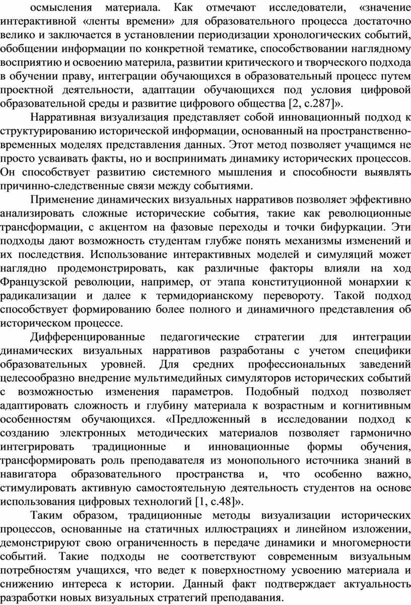 Применение динамических визуальных нарративов позволяет эффективно анализировать сложные исторические события, такие как революционные трансформации, с акцентом на фазовые переходы и точки бифуркации. Эти подходы дают возможность студентам глубже понять механизмы изменений и их последствия. Использование интерактивных моделей и симуляций может наглядно продемонстрировать, как различные факторы влияли на ход Французской революции, например, от этапа конституционной монархии к радикализации и далее к термидорианскому перевороту. Такой подход способствует формированию более полного и динамичного представления об историческом процессе.