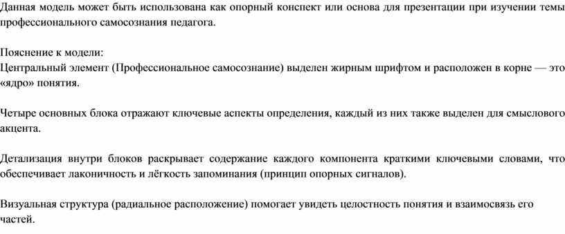 Данная модель может быть использована как опорный конспект или основа для презентации при изучении темы профессионального самосознания педагога.