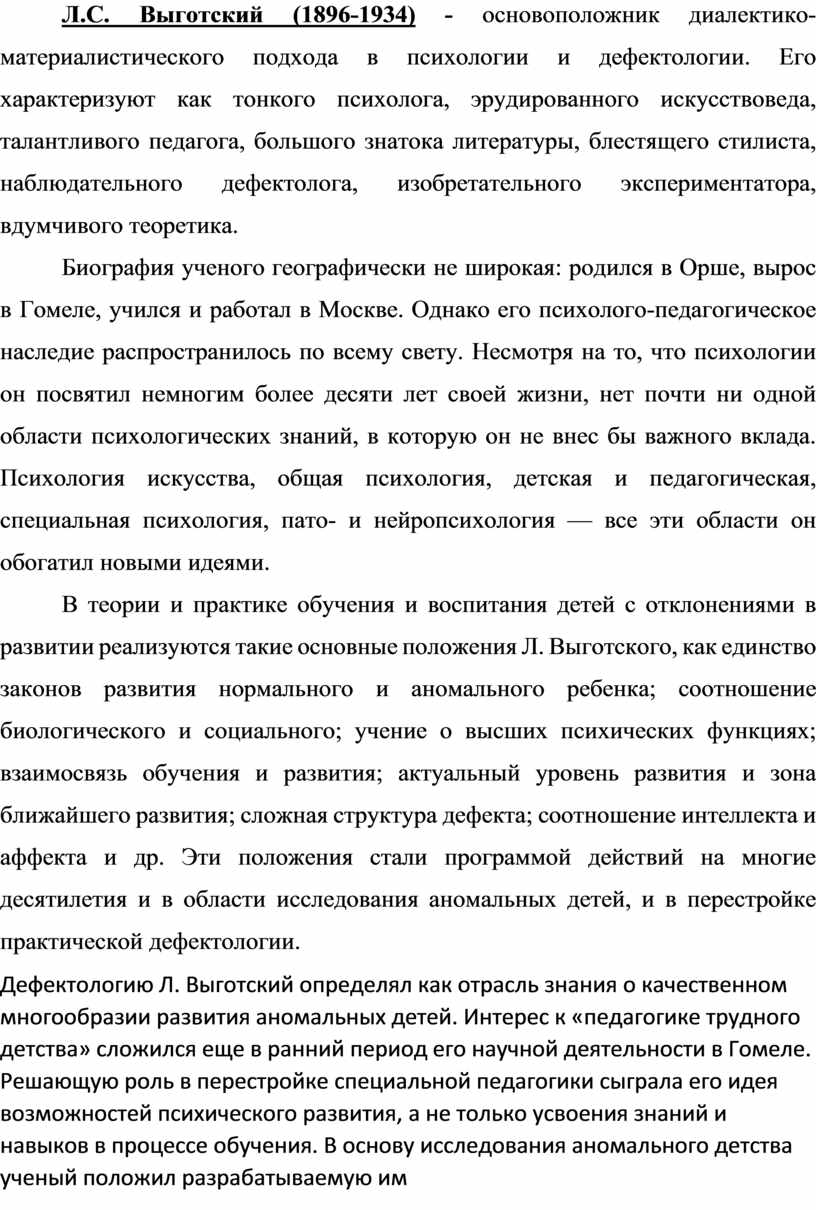 Л.С. Выготский (1896-1934) - основоположник диалектико-материалистического подхода в психологии и дефектологии. Его характеризуют как тонкого психолога, эрудированного искусствоведа, талантливого педагога, большого знатока литературы, блестящего стилиста, наблюдательного дефектолога, изобретательного экспериментатора, вдумчивого теоретика.