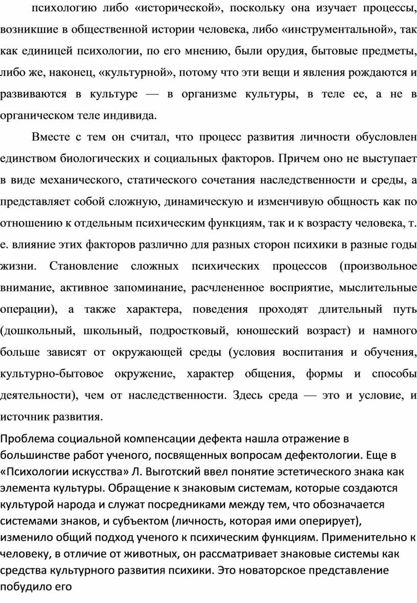 Проблема социальной компенсации дефекта нашла отражение в большинстве работ ученого, посвященных вопросам дефектологии. Еще в «Психологии искусства» Л. Выготский ввел понятие эстетического знака как элемента культуры. Обращение к знаковым системам, которые создаются культурой народа и служат посредниками между тем, что обозначается системами знаков, и субъектом (личность, которая ими оперирует), изменило общий подход ученого к психическим функциям. Применительно к человеку, в отличие от животных, он рассматривает знаковые системы как средства культурного развития психики. Это новаторское представление побудило его включить в круг психических функций человека знаково-опосредованный уровень их организации.