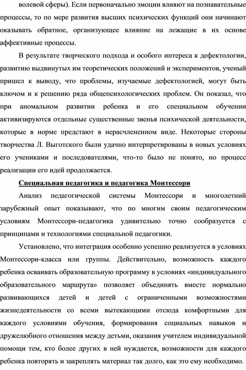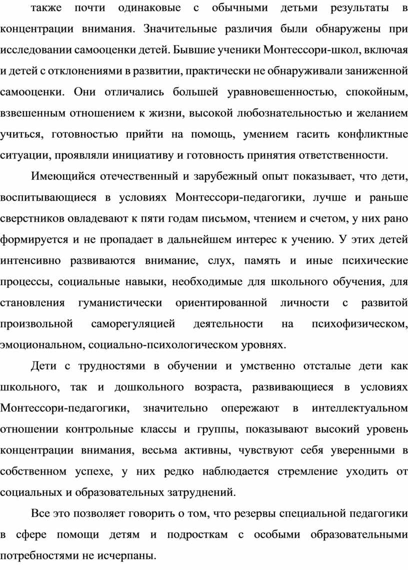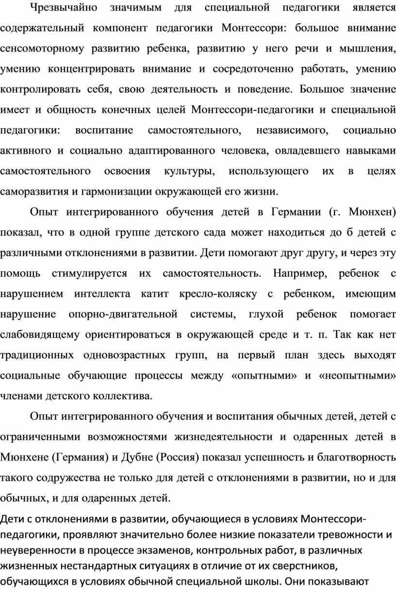 Анализ педагогической системы Монтессори и многолетний зарубежный опыт показывают, что по многим своим педагогическим условиям Монтессори-педагогика удивительно точно сообразуется с принципами и технологиями специальной педагогики.
