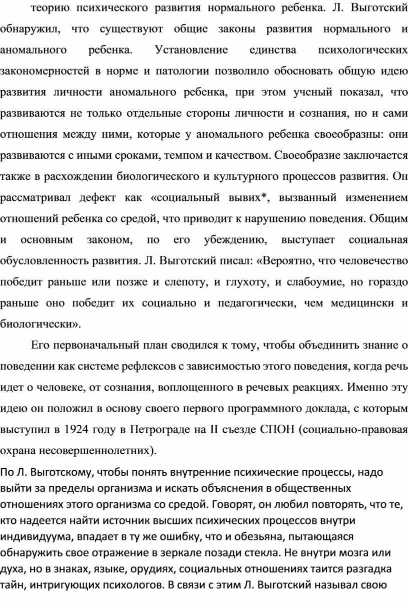 Дефектологию Л. Выготский определял как отрасль знания о качественном многообразии развития аномальных детей. Интерес к «педагогике трудного детства» сложился еще в ранний период его научной деятельности в Гомеле. Решающую роль в перестройке специальной педагогики сыграла его идея возможностей психического развития, а не только усвоения знаний и навыков в процессе обучения. В основу исследования аномального детства ученый положил разрабатываемую им теорию психического развития нормального ребенка. Л. Выготский обнаружил, что существуют общие законы развития нормального и аномального ребенка. Установление единства психологических закономерностей в норме и патологии позволило обосновать общую идею развития личности аномального ребенка, при этом ученый показал, что развиваются не только отдельные стороны личности и сознания, но и сами отношения между ними, которые у аномального ребенка своеобразны: они развиваются с иными сроками, темпом и качеством. Своеобразие заключается также в расхождении биологического и культурного процессов развития. Он рассматривал дефект как «социальный вывих*, вызванный изменением отношений ребенка со средой, что приводит к нарушению поведения. Общим и основным законом, по его убеждению, выступает социальная обусловленность развития. Л. Выготский писал: «Вероятно, что человечество победит раньше или позже и слепоту, и глухоту, и слабоумие, но гораздо раньше оно победит их социально и педагогически, чем медицински и биологически».