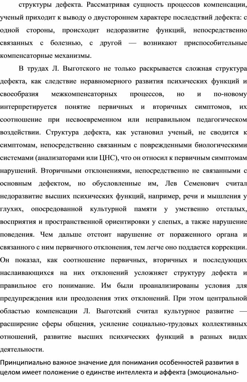 В трудах Л. Выготского не только раскрывается сложная структура дефекта, как следствие неравномерного развития психических функций и своеобразия межкомпенсаторных процессов, но и по-новому интерпретируется понятие первичных и вторичных симптомов, их соотношение при несвоевременном или неправильном педагогическом воздействии. Структура дефекта, как установил ученый, не сводится к симптомам, непосредственно связанным с поврежденными биологическими системами (анализаторами или ЦНС), что он относил к первичным симптомам нарушений. Вторичными отклонениями, непосредственно не связанными с основным дефектом, но обусловленные им, Лев Семенович считал недоразвитие высших психических функций, например, речи и мышления у глухих, опосредованной культурной памяти у умственно отсталых, восприятия и пространственной ориентировки у слепых, а также нарушение поведения. Чем дальше отстоит нарушение от пораженного органа и связанного с ним первичного отклонения, тем легче оно поддается коррекции. Он показал, как соотношение первичных, вторичных и последующих наслаивающихся на них отклонений усложняет структуру дефекта и правильное его понимание. Им были проанализированы условия для предупреждения или преодоления этих отклонений. При этом центральной областью компенсации Л. Выготский считал культурное развитие — расширение сферы общения, усиление социально-трудовых коллективных отношений, развитие высших психических функций в разных видах деятельности.