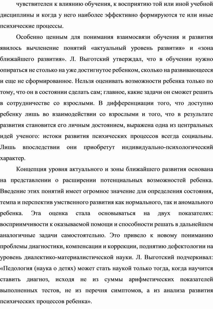 Концепция уровня актуального и зоны ближайшего развития основана на представлении о расширении потенциальных возможностей ребенка. Введение этих понятий имеет огромное значение для определения состояния, темпа и перспектив умственного развития как нормального, так и аномального ребенка. Эта оценка стала основываться на двух показателях: восприимчивости к оказываемой помощи и способности решать в дальнейшем аналогичные задачи самостоятельно. Это привело к новому пониманию проблемы диагностики, компенсации и коррекции, поднятию дефектологии на уровень диалектико-материалистической науки. Л. Выготский подчеркивал: «Педология (наука о детях) может стать наукой только тогда, когда научится ставить диагноз, исходя не из суммы арифметических показателей выполненных тестов, не из перечня симптомов, а из анализа развития психических процессов ребенка».