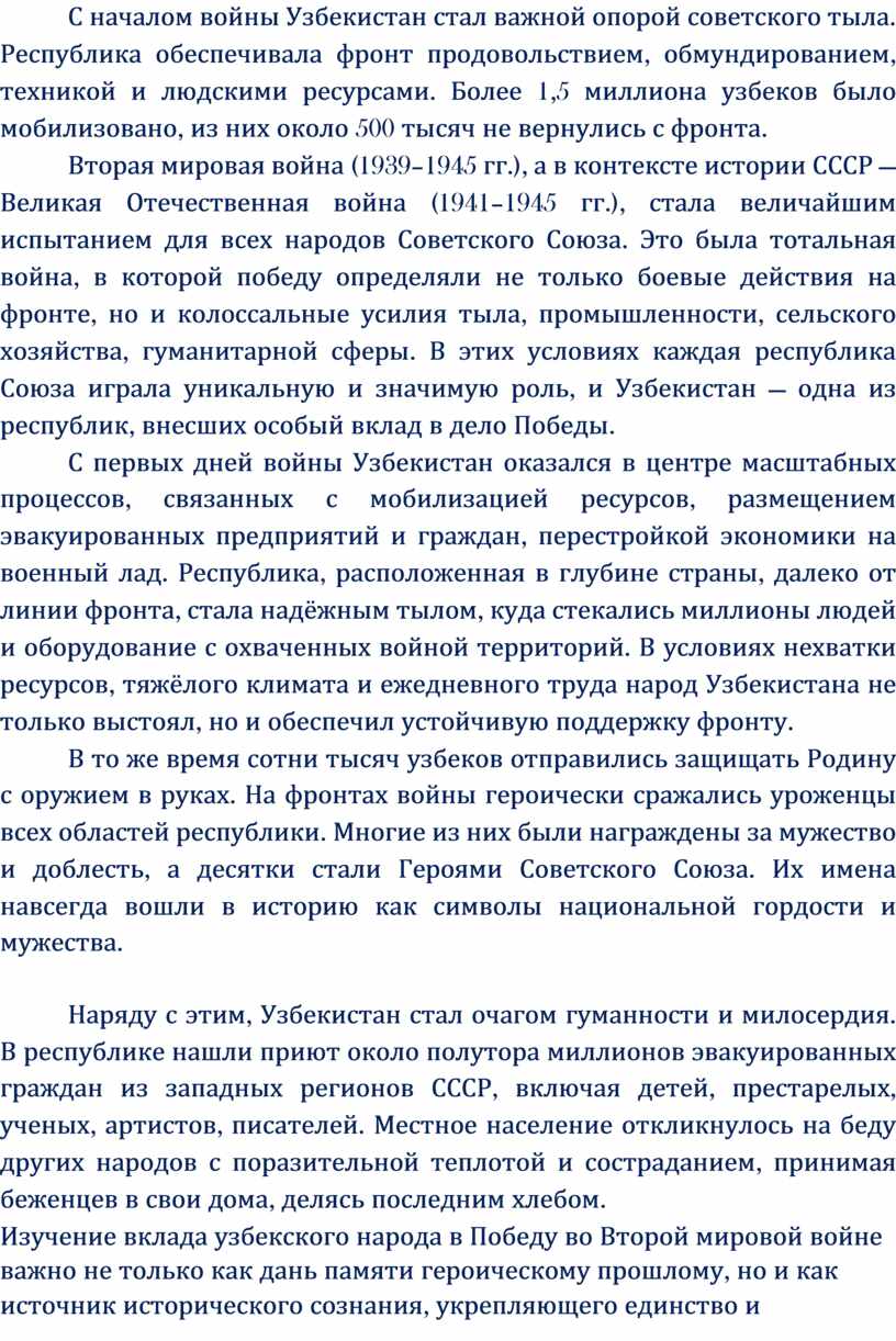 Вторая мировая война (1939–1945 гг.), а в контексте истории СССР — Великая Отечественная война (1941–1945 гг.), стала величайшим испытанием для всех народов Советского Союза. Это была тотальная война, в которой победу определяли не только боевые действия на фронте, но и колоссальные усилия тыла, промышленности, сельского хозяйства, гуманитарной сферы. В этих условиях каждая республика Союза играла уникальную и значимую роль, и Узбекистан — одна из республик, внесших особый вклад в дело Победы.