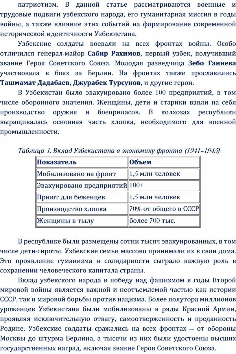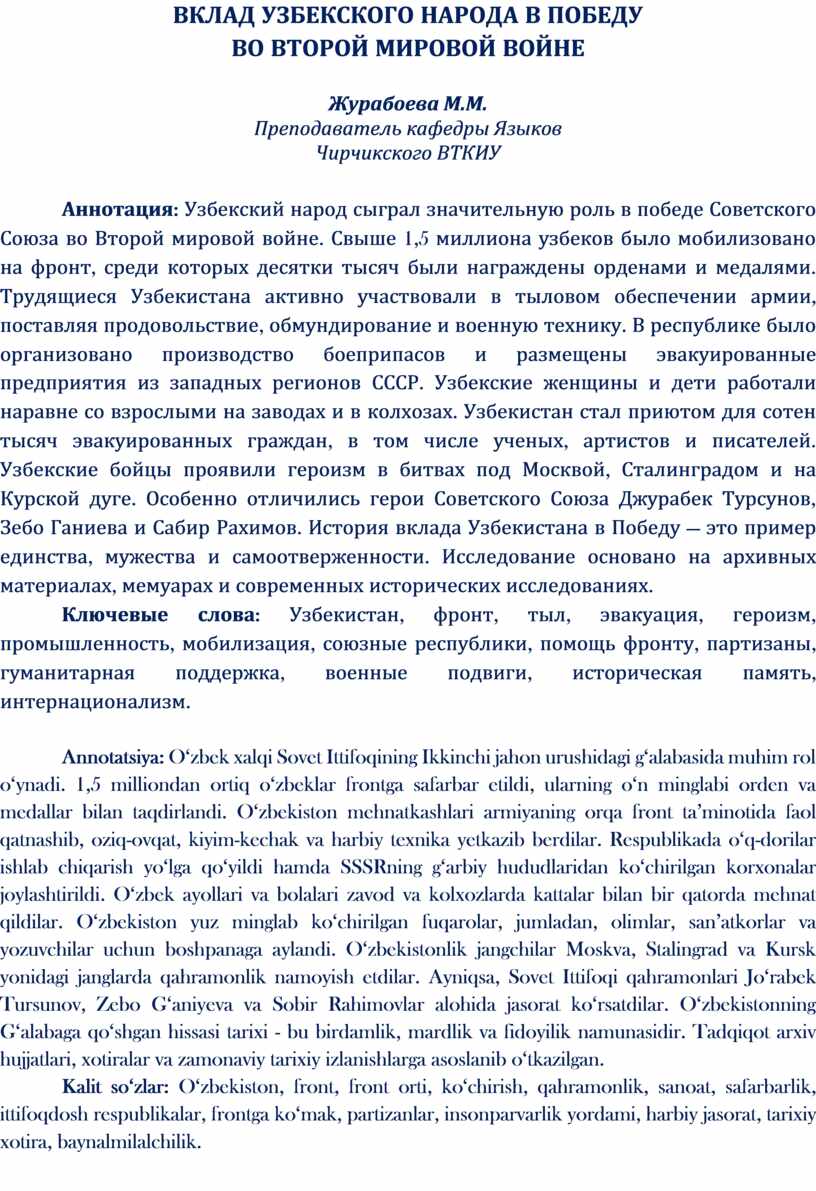 Ключевые слова: Узбекистан, фронт, тыл, эвакуация, героизм, промышленность, мобилизация, союзные республики, помощь фронту, партизаны, гуманитарная поддержка, военные подвиги, историческая память, интернационализм.