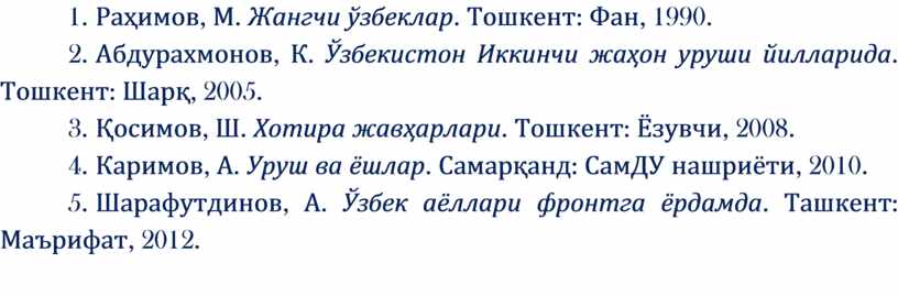 2. Раҳимов, М. Жангчи ўзбеклар. Тошкент: Фан, 1990.