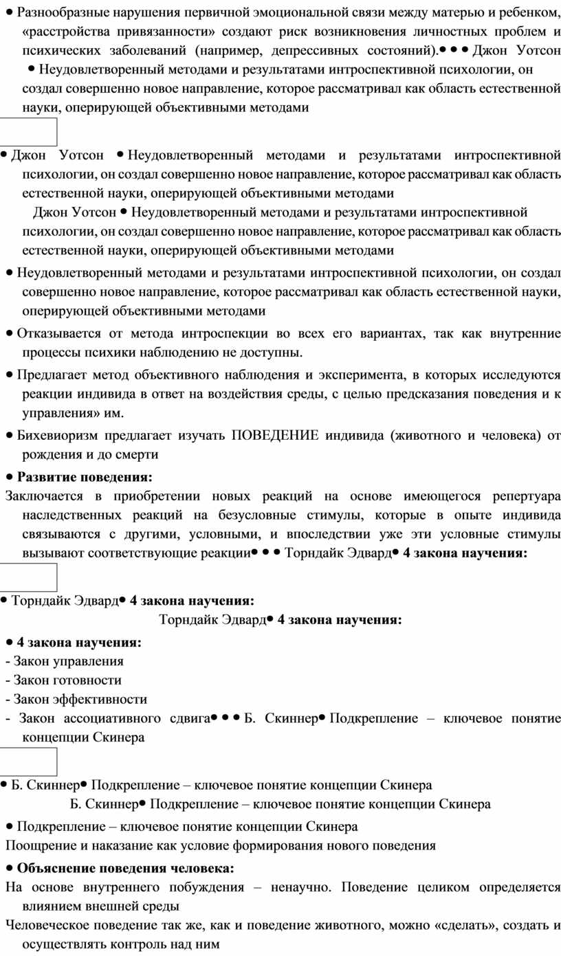 · Неудовлетворенный методами и результатами интроспективной психологии, он создал совершенно новое направление, которое рассматривал как область естественной науки, оперирующей объективными методами · Отказывается от метода интроспекции во всех его вариантах, так как внутренние процессы психики наблюдению не доступны. · Предлагает метод объективного наблюдения и эксперимента, в которых исследуются реакции индивида в ответ на воздействия среды, с целью предсказания поведения и к управления» им. · Бихевиоризм предлагает изучать ПОВЕДЕНИЕ индивида (животного и человека) от рождения и до смерти · Развитие поведения: Заключается в приобретении новых реакций на основе имеющегося репертуара наследственных реакций на безусловные стимулы, которые в опыте индивида связываются с другими, условными, и впоследствии уже эти условные стимулы вызывают соответствующие реакции |
