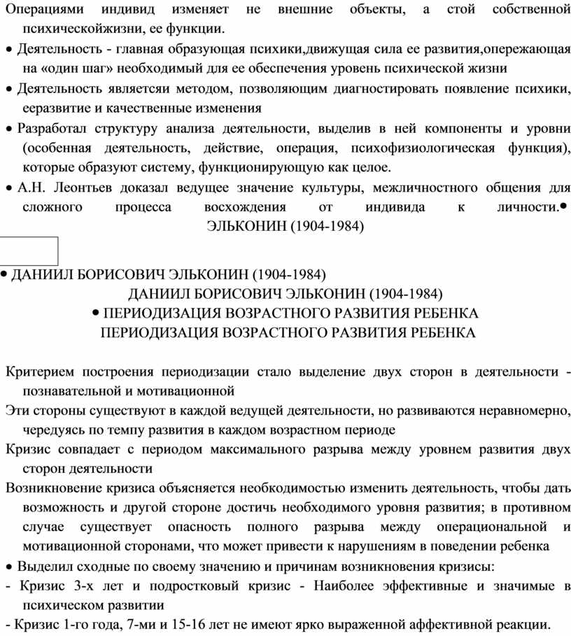 Критерием построения периодизации стало выделение двух сторон в деятельности - познавательной и мотивационной Эти стороны существуют в каждой ведущей деятельности, но развиваются неравномерно, чередуясь по темпу развития в каждом возрастном периоде Кризис совпадает с периодом максимального разрыва между уровнем развития двух сторон деятельности Возникновение кризиса объясняется необкодимостью изменить деятельность, чтобы дать возможность и другой стороне достичь необходимого уровня развития; в противном случае существует опасность полного разрыва между операциональной и мотивационной сторонами, что может привести к нарушениям в поведении ребенка · Выделил сходные по своему значению и причинам возникновения кризисы: - Кризис 3-х лет и подростковый кризис - Наиболее эффективные и значимые в психическом развитии - Кризис 1-го года, 7-ми и 15-16 лет не имеют ярко выраженной аффективной реакции. Каждый период истории человечества, каждая культура формирует свои законы развития детской психики в зависимости от требований, предъявляемых обществом. |
