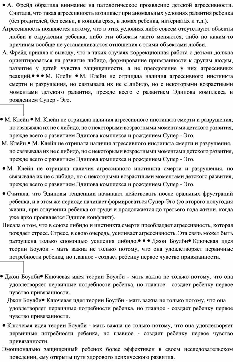 · М. Клейн не отрицала наличия агрессивного инстинкта смерти и разрушения, но связывала их не с либидо, но с некоторыми возрастными моментами детского развития, прежде всего с развитием Эдипова комплекса и рождением Супер - Эго. · Считала, что Эдиповы тенденции начинают действовать после оральных фрустраций ребенка, и в этом же периоде начинает формироваться Супер-Эго (со второго полугодия жизни, при отлучении ребенка от груди и продолжается до третьего года жизни, когда уже ярко проявляется Эдипов конфликт). Писала о том, что в союзе либидо и инстинкта смерти преобладает агрессивность, которая рождает стресс. Стресс, в свою очередь, усиливает агрессивность. Эта связь может быть разрушена только спомощью усиления либидо. |