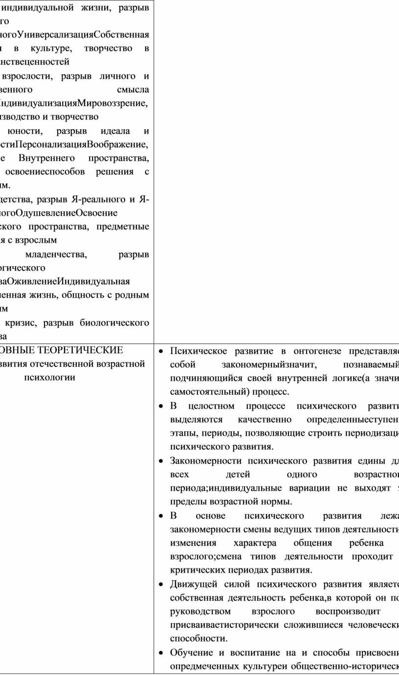 В.И. Слободчиков. Ступени развития субъекта · Кризис индивидуальной жизни, разрыв телесного идуховногоУниверсализацияСобственная позиция в культуре, творчество в пространствеценностей · Кризис взрослости, разрыв личного и общественного смысла жизниИндивидуализацияМировоззрение, воспроизводство и творчество · Кризис юности, разрыв идеала и реальностиПерсонализацияВоображение, создание Внутреннего пространства, поиск, освоениеспособов решения с взрослым. · Кризис детства, разрыв Я-реального и Я-идеальногоОдушевлениеОсвоение физического пространства, предметные действия с взрослым · Кризис младенчества, разрыв психологического симбиозаОживлениеИндивидуальная обособленная жизнь, общность с родным взрослым · Родовой кризис, разрыв биологического симбиоза |