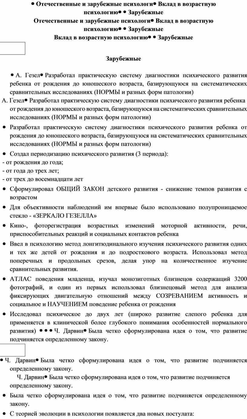 · Разработал практическую систему диагностики психического развития ребенка от рождения до юношеского возраста, базирующуюся на систематических сравнительных исследованиях (НОРМЫ и разных форм патологии) · Создал периодизацию психического развития (3 периода): - от рождения до года; - от года до трех лет; - от трех до восемнадцати лет · Сформулировал ОБЩИЙ ЗАКОН детского развития - снижение темпов развития с возрастом · Для объективности наблюдений им впервые было использовано полупроницаемое стекло - «ЗЕРКАЛО ГЕЗЕЛЛА» · Кино-, фоторегистрация возрастных изменений моторной активности, речи, приспособительных реакций и социальных контактов ребенка · Ввел в психологию метод лонгитюдинального изучения психического развития одних и тех же детей от рождения и до подросткового возраста. Использовал метод поперечных и продольных срезов, делая упор на количественное изучение сравнительных развития. · АТЛАС поведения младенца, изучал монозиготных близнецов содержащий 3200 фотографий, и один из первых использовал близнецовый метод для анализа фиксирующих двигательную отношений между СОЗРЕВАНИЕМ активность и социальное и НАУЧЕНИЕМ поведение ребенка от рождения · Исследовал психическое до двух лет (широко развитие слепого ребенка для применяется в клинической более глубокого понимания особенностей нормального развития) |