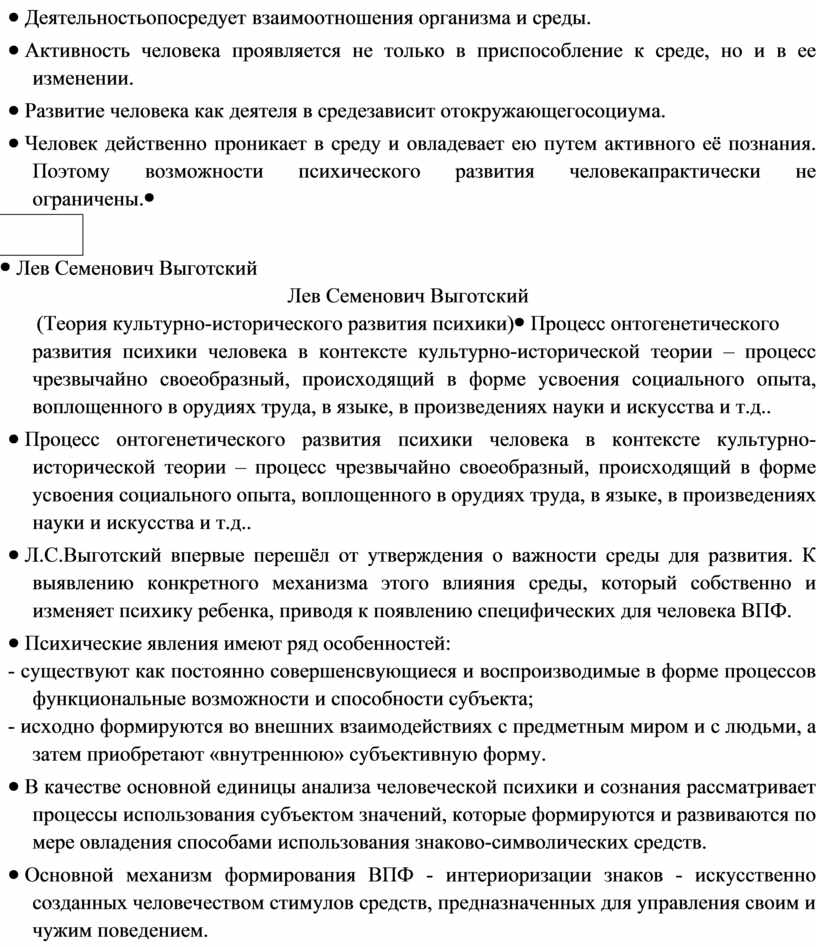 · Процесс онтогенетического развития психики человека в контексте культурно-исторической теории – процесс чрезвычайно своеобразный, происходящий в форме усвоения социального опыта, воплощенного в орудиях труда, в языке, в произведениях науки и искусства и т.д.. · Л.С.Выготский впервые перешёл от утверждения о важности среды для развития. К выявлению конкретного механизма этого влияния среды, который собственно и изменяет психику ребенка, приводя к появлению специфических для человека ВПФ. · Психические явления имеют ряд особенностей: - существуют как постоянно совершенсвующиеся и воспроизводимые в форме процессов функциональные возможности и способности субъекта; - исходно формируются во внешних взаимодействиях с предметным миром и с людьми, а затем приобретают «внутреннюю» субъективную форму. · В качестве основной единицы анализа человеческой психики и сознания рассматривает процессы использования субъектом значений, которые формируются и развиваются по мере овладения способами использования знаково-символических средств. · Основной механизм формирования ВПФ - интериоризации знаков - искусственно созданных человечеством стимулов средств, предназначенных для управления своим и чужим поведением. · Натуральные психические функции не поддаются регуляции со стороны человека; высшими психическими функциями люди могут сознательно управлять. Эта регуляция связана с их опосредованным характером (опосредуются знаком или стимулом средством, который создаетдополнительную связь, между и R человека: как поведенческой, так и мыслительной. · Знаки в отличие от стимула-средства (например, палочка вместо градусника) не изобретаются детьми, но приобретаются ими в общении со взрослыми. Знак появляется вначале во внешнем плане, в плане общения, а затем переходит во внутренний план, план сознания: Каждая высшая психическая функция появляется на сцене дважды: один раз как внешняя, интерпсихическая, второй - как внутренняя, интрапсихическая. · Благодаря интериоризации знаков у детей формируется знаковая функция сознания. Происходит становление таких собственно человеческих психических процессов как логическое мышление, воля, речь. · В культурно-исторической концепции сформулировано ряд законовпсихического развития ребенка: 1. Закон развития высших психических функций. ВПФ возникают как форма коллективного поведения, форма сотрудничества с другими людьми и лишь затемстановятся индивидуальными (внутрипсихическими) функциями самого ребенка. Становясь внутренними, они приобретают опосредованность, осознанность, произвольность, системность. 2. Детское развитие имеет сложную организацию во времени, его ритм не совпадает с хронологическим возрастом, т.е. имеет свой ритм, отличающийся от ритма биологического созревания. Оно имеетсвой темп (гетерохронность развития). 3 Закон неравномерности детского развития. Каждая сторона в психикеребенка имеет свой оптимальный период развития - сензитивный период. 4. Закон метаморфозы определяет развитиекак последовательное изменение качественныхсостояний сознания (структуры сознания). Развитие есть цель качественных изменений:ребенок не маленький взрослый, а существо обладающее качественно отличной от взрослого психикой. 5 Закон среды определяет роль социальной среды как источн