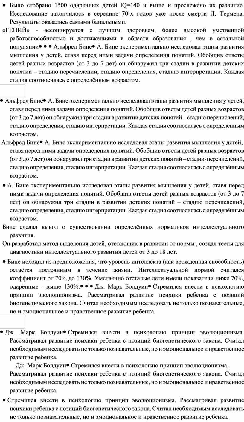 · A. Бине экспериментально исследовал этапы развития мышления у детей, ставя перед ними задачи определения понятий. Обобщив ответы детей разных возрастов (от 3 до 7 лет) он обнаружил три стадии в развитии детских понятий – стадию перечислений, стадию определения, стадию интерпретации. Каждая стадия соотносилась с определённым возрастом. Бине сделал вывод о существовании определённых нормативов интеллектуального развития. Он разработал метод выделения детей, отстающих в развитии от нормы , создал тесты для диагностики интеллектуального развития детей от 3 до 18 лет. · Бине исходил из предположения, что уровень интеллекта (как врождённая способность) остаётся постоянным в течение жизни. Интеллектуальной нормой считался коэффициент от 70% до 130%. Умственно отсталые дети имели показатели ниже 70%, одарённые - выше 130%. |
