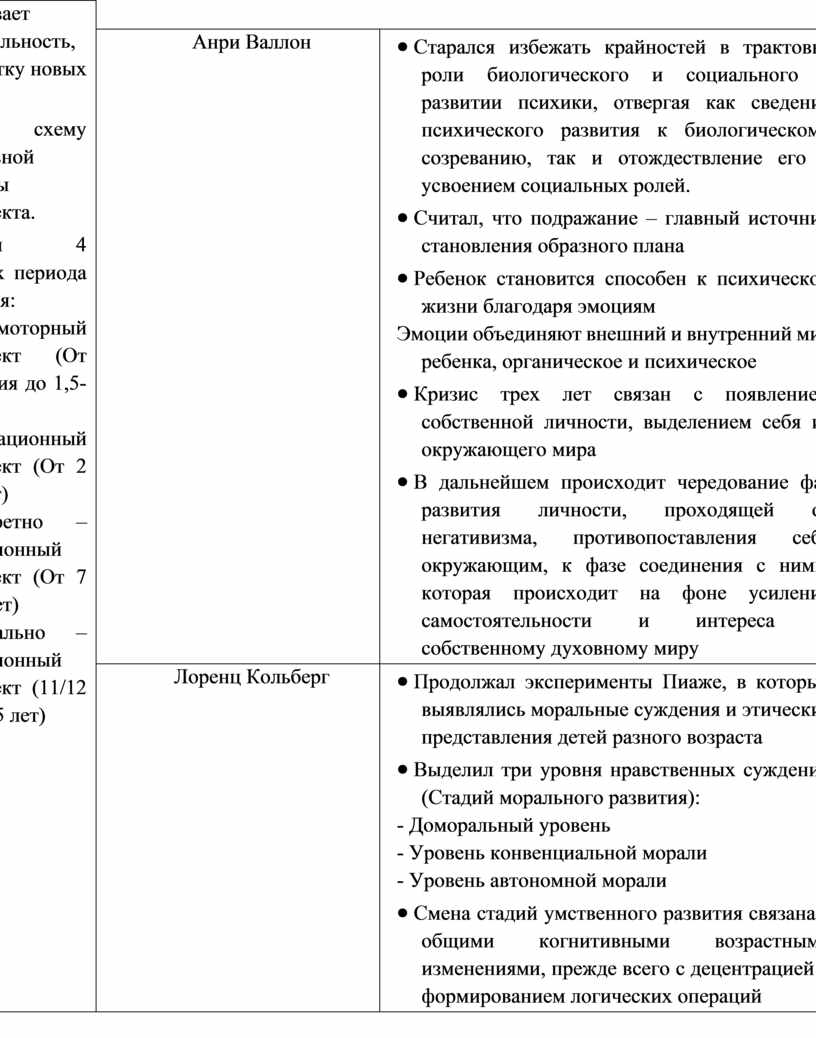 · Старался избежать крайностей в трактовке роли биологического и социального в развитии психики, отвергая как сведение психического развития к биологическому созреванию, так и отождествление его с усвоением социальных ролей. · Считал, что подражание – главный источник становления образного плана · Ребенок становится способен к психической жизни благодаря эмоциям Эмоции объединяют внешний и внутренний мир ребенка, органическое и психическое · Кризис трех лет связан с появлением собственной личности, выделением себя из окружающего мира · В дальнейшем происходит чередование фаз развития личности, проходящей от негативизма, противопоставления себя окружающим, к фазе соединения с ними, которая происходит на фоне усиления самостоятельности и интереса к собственному духовному миру |