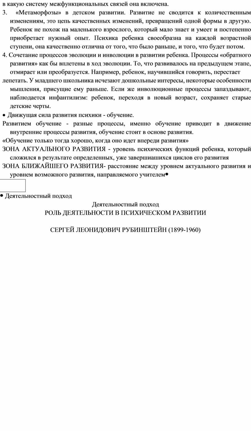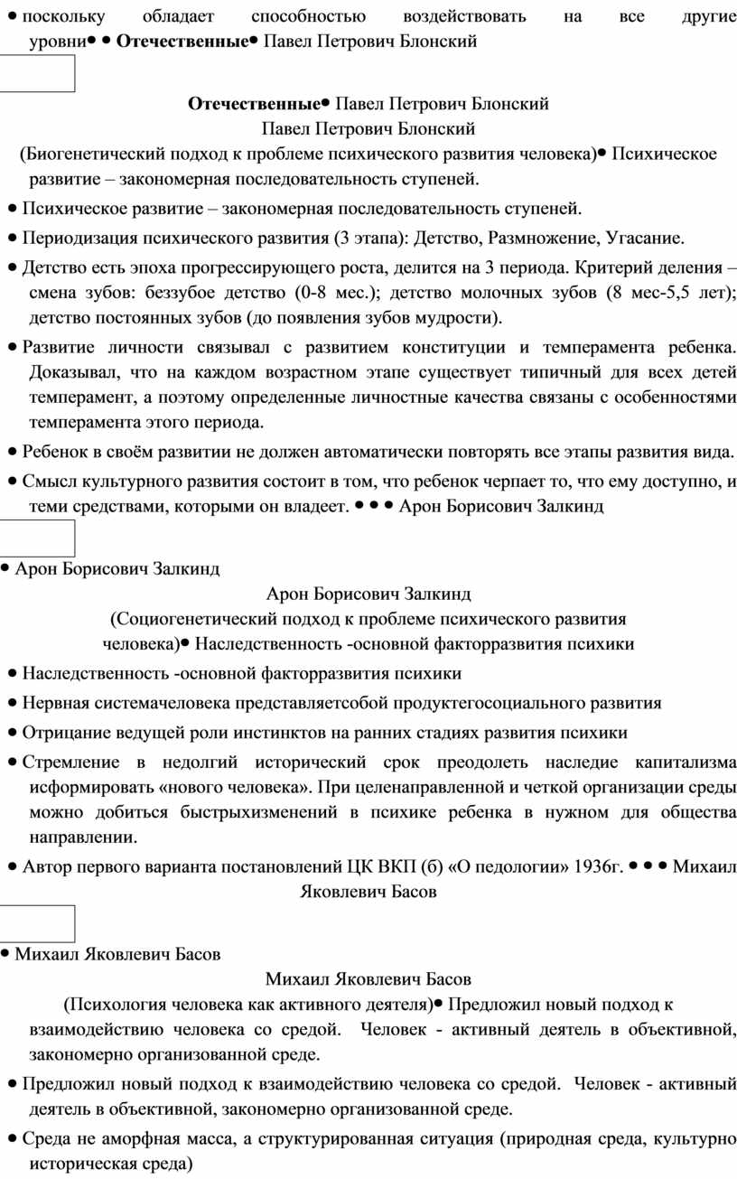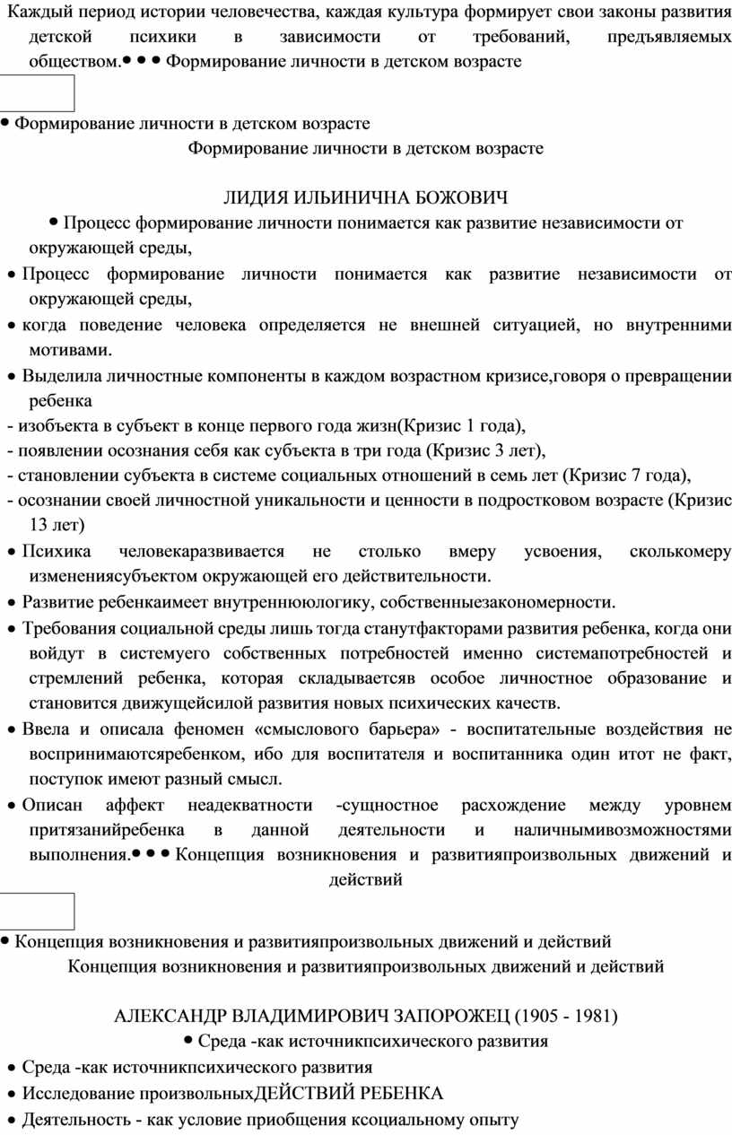 · Психическое развитие – закономерная последовательность ступеней. · Периодизация психического развития (3 этапа): Детство, Размножение, Угасание. · Детство есть эпоха прогрессирующего роста, делится на 3 периода. Критерий деления – смена зубов: беззубое детство (0-8 мес.); детство молочных зубов (8 мес-5,5 лет); детство постоянных зубов (до появления зубов мудрости). · Развитие личности связывал с развитием конституции и темперамента ребенка. Доказывал, что на каждом возрастном этапе существует типичный для всех детей темперамент, а поэтому определенные личностные качества связаны с особенностями темперамента этого периода. · Ребенок в своём развитии не должен автоматически повторять все этапы развития вида. · Смысл культурного развития состоит в том, что ребенок черпает то, что ему доступно, и теми средствами, которыми он владеет. |