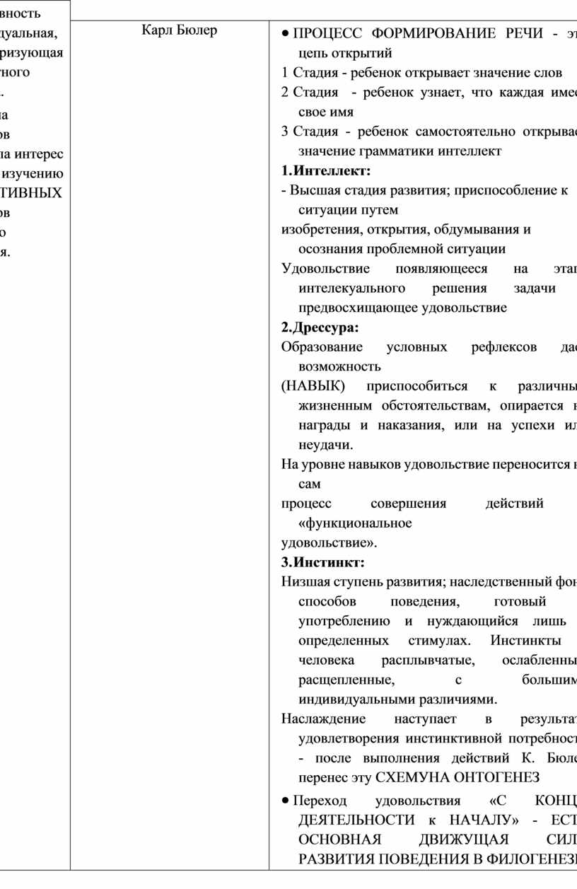 · ПРОЦЕСС ФОРМИРОВАНИЕ РЕЧИ - это цепь открытий 1 Стадия - ребенок открывает значение слов 2 Стадия - ребенок узнает, что каждая имеет свое имя 3 Стадия - ребенок самостоятельно открывает значение грамматики интеллект 1. Интеллект: - Высшая стадия развития; приспособление к ситуации путем изобретения, открытия, обдумывания и осознания проблемной ситуации Удовольствие появляющееся на этапе интелекуального решения задачи - предвосхищающее удовольствие 2. Дрессура: Образование условных рефлексов дает возможность (НАВЫК) приспособиться к различным жизненным обстоятельствам, опирается на награды и наказания, или на успехи или неудачи. На уровне навыков удовольствие переносится на сам процесс совершения действий - «функциональное удовольствие». 3. Инстинкт: Низшая ступень развития; наследственный фонд способов поведения, готовый к употреблению и нуждающийся лишь в определенных стимулах. Инстинкты у человека расплывчатые, ослабленные, расщепленные, с большими индивидуальными различиями. Наслаждение наступает в результате удовлетворения инстинктивной потребности - после выполнения действий К. Бюлер перенес эту СХЕМУНА ОНТОГЕНЕЗ · Переход удовольствия «С КОНЦА ДЕЯТЕЛЬНОСТИ к НАЧАЛУ» - ЕСТЬ ОСНОВНАЯ ДВИЖУЩАЯ СИЛА РАЗВИТИЯ ПОВЕДЕНИЯ В ФИЛОГЕНЕЗЕ. |