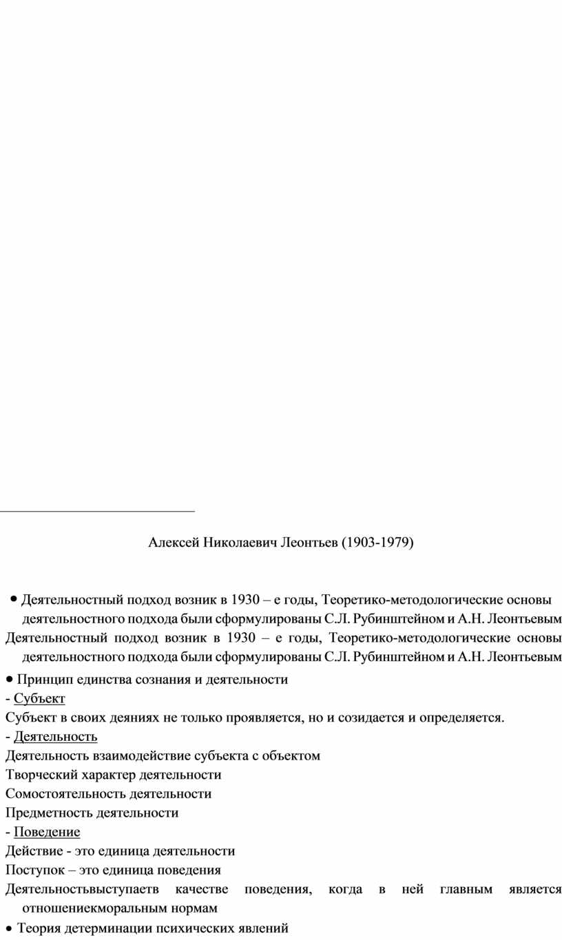 Деятельностный подход возник в 1930 – е годы, Теоретико-методологические основы деятельностного подхода были сформулированы С.Л. Рубинштейном и А.Н. Леонтьевым · Принцип единства сознания и деятельности - Субъект Субъект в своих деяниях не только проявляется, но и созидается и определяется. - Деятельность Деятельность взаимодействие субъекта с объектом Творческий характер деятельности Сомостоятельность деятельности Предметность деятельности - Поведение Действие - это единица деятельности Поступок – это единица поведения Деятельностьвыступаетв качестве поведения, когда в ней главным является отношениекморальным нормам · Теория детерминации психических явлений ВНЕШНИЕ ПРИЧИНЫ ВОЗДЕЙСТВУЮ НА ОБЪЕКТ ПОСРЕДСТВОМ ВНУТРЕННИХ УСЛОВИЙ - Активная роль внутренних условий, опосредствующих все внешние воздействия - В процессе развития возрастает удельный вес внутренних условий преломляющих все внешние воздействия - Внутренние условия формируются в зависимости от предшествующих внешних воздействий · Деятельность определяется своим объектом не прямо, а опосредованно, через ее внутренние, специфические закономерности (цели, мотивы и т.д.). · Преломления внешнего через внутреннее означает опосредование внешних воздействий всей историей развития личности. · Личность понимается им в совокупности своих отношений с окружающим миром, реализующихся посредством деятельности, познания и общения. Личность есть основание связи всех психических процессов, й принадлежащих и управляемых. · РОЛЬ ДЕЯТЕЛЬНОСТИ В ПСИХИЧЕСКОМ РАЗВИТИИ Вопрос об отношении сознания и предметной, практической деятельности Психика формируется не внутри мозга, з в реальных формах общественной жизни, скоторой индивид общается посредством ипсихических орудий" - знаков, созданныхкультурой. Эти знаки выполняют орудийный характер. Операциями индивид изменяет не внешние объекты, а стой собственной психическойжизни, ее функции. · Деятельность - главная образующая психики,движущая сила ее развития,опережающая на «один шаг» необходимый для ее обеспечения уровень психической жизни · Деятельность являетсяи методом, позволяющим диагностировать появление психики, ееразвитие и качественные изменения · Разработал структуру анализа деятельности, выделив в ней компоненты и уровни (особенная деятельность, действие, операция, психофизиологическая функция), которые образуют систему, функционирующую как целое. · А.Н. Леонтьев доказал ведущее значение культуры, межличностного общения для сложного процесса восхождения от индивида к личности. |