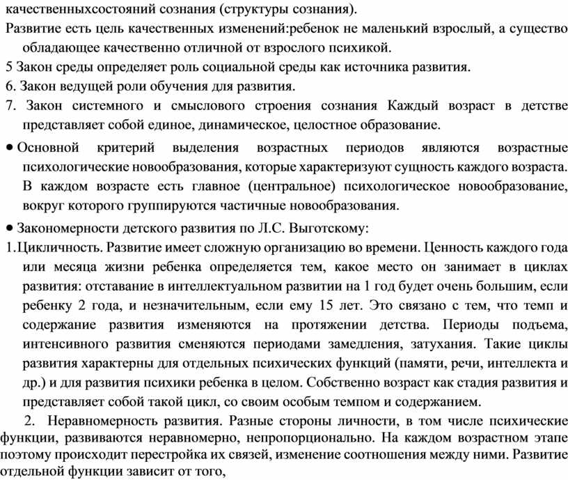 · Психическое развитие в онтогенезе представляет собой закономерныйзначит, познаваемый), подчиняющийся своей внутренней логике(а значит, самостоятельный) процесс. · В целостном процессе психического развития выделяются качественно определенныеступени, этапы, периоды, позволяющие строить периодизации психического развития. · Закономерности психического развития едины для всех детей одного возрастного периода;индивидуальные вариации не выходят за пределы возрастной нормы. · В основе психического развития лежат закономерности смены ведущих типов деятельностии изменения характера общения ребенка и взрослого;смена типов деятельности проходит в критических периодах развития. · Движущей силой психического развития является собственная деятельность ребенка,в которой он под руководством взрослого воспроизводит и присваиваетисторически сложившиеся человеческие способности. · Обучение и воспитание на и способы присвоения опредмеченных культуреи общественно-исторически заданных способностей являютсявсеобщими формами психического развития человека. · Посредствтомизменния практики образования и общественного воспитания. |