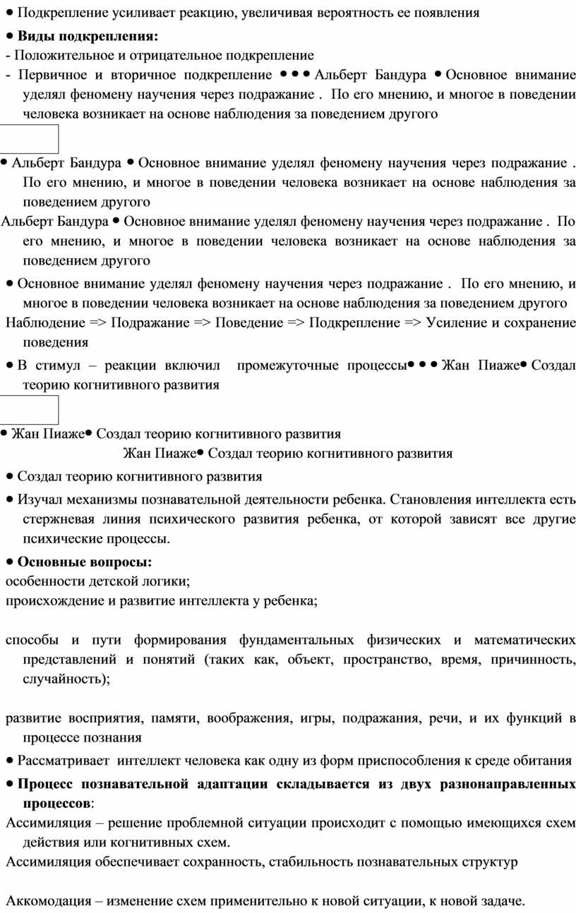 Индивидуальные различия заключаются не только в скорости усвоения, но и в возможности адаптации к тем нормам, которые приняты в обществе. · Процесс социализации влияет на формирование самооценки. · Отметил социальную роль игры и рассмотрел ее не только как форму предупражнения, но и как инструмент социализации, подчеркнув, что она подготавливает человека к жизни среди сложных социальных отношений. · Рассмотрел понятия "одаренность и гениальность". · Выделил специальные механизмы развития мышления ассимиляцию (интериоризацию воздействий среды) иаккомодацию (изменения организма). |
