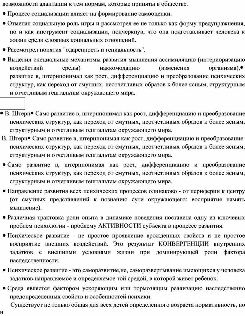 · Само развитие в, штернпонимал как рост, дифференциацию и преобразование психических структур, как переход от смутных, неотчетливых образов к более ясным, структурным и отчетливым гештальтам окружающего мира. · Направление развития всех психических процессов одинаково - от периферии к центру (от смутных представлений к познанию сути окружающего: восприятие память мышление). · Различная трактовка роли опыта в динамике поведения поставила одну из ключевых проблем психологии - проблему АКТИВНОСТИ субъекта в процессе развития. · Психическое развитие - не простое проявление врожденных свойств и не простое восприятие внешних воздействий. Это результат КОНВЕРГЕНЦИИ внутренних задатков с внешними условиями жизни при доминирующей роли фактора наследственности. · Психическое развитие - это саморазвитие,не, саморазвертывание имеющихся у человека задатков направляемое и определяемое той средой, в которой живет ребенок. · Среда является фактором ускоряющим или тормозящим реализацию наследственно предопределенных свойств и особенностей психики. · Существует не только общая для всех детей определенного возраста нормативность, но и нормативность индивидуальная, характеризующая конкретного ребенка. · Проблема факторов породила интерес к изучению СЕНЗИТИВНЫХ периодов детского развития. |