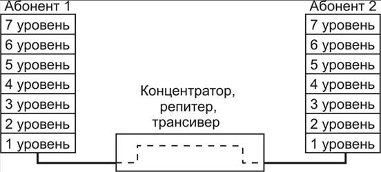 Концентратор (Hub) – устройство физического подключения не- скольких сегментов или лучей локальной сети. Интеллектуальный хаб (Intelligent Hub) имеет специальные средства для диагностики и управ- ления, что позволяет оперативно получать сведения об активности и ис- правности узлов, отключать неисправные узлы.