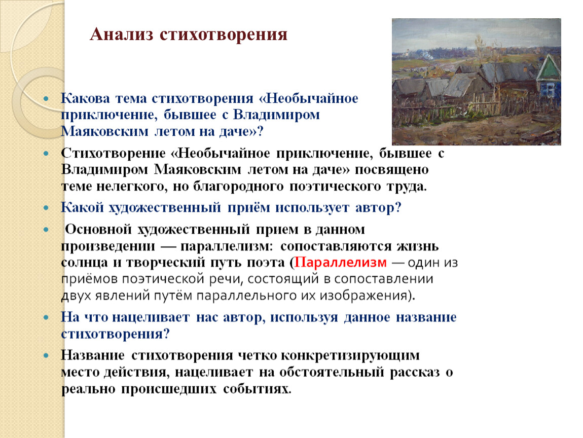 Стихотворение «Необычайное приключение, бывшее с Владимиром Маяковским летом на даче» посвящено теме нелегкого, но благородного поэтического труда.