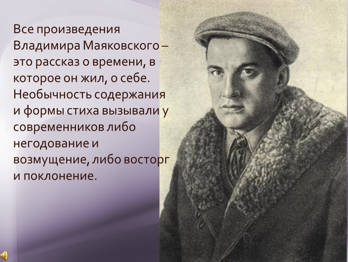 Все произведения Владимира Маяковского – это рассказ о времени, в которое он жил, о себе. Необычность содержания и формы стиха вызывали у современников либо негодование и возмущение, либо восторг и поклонение.