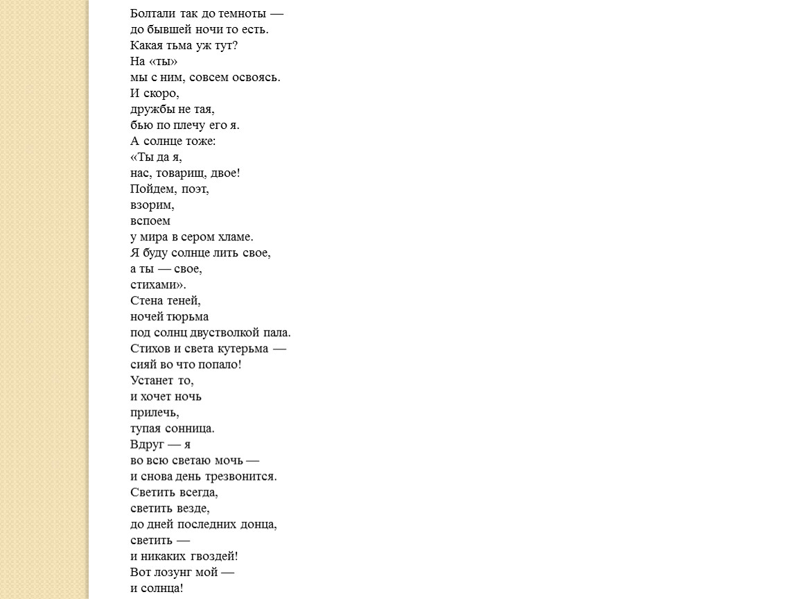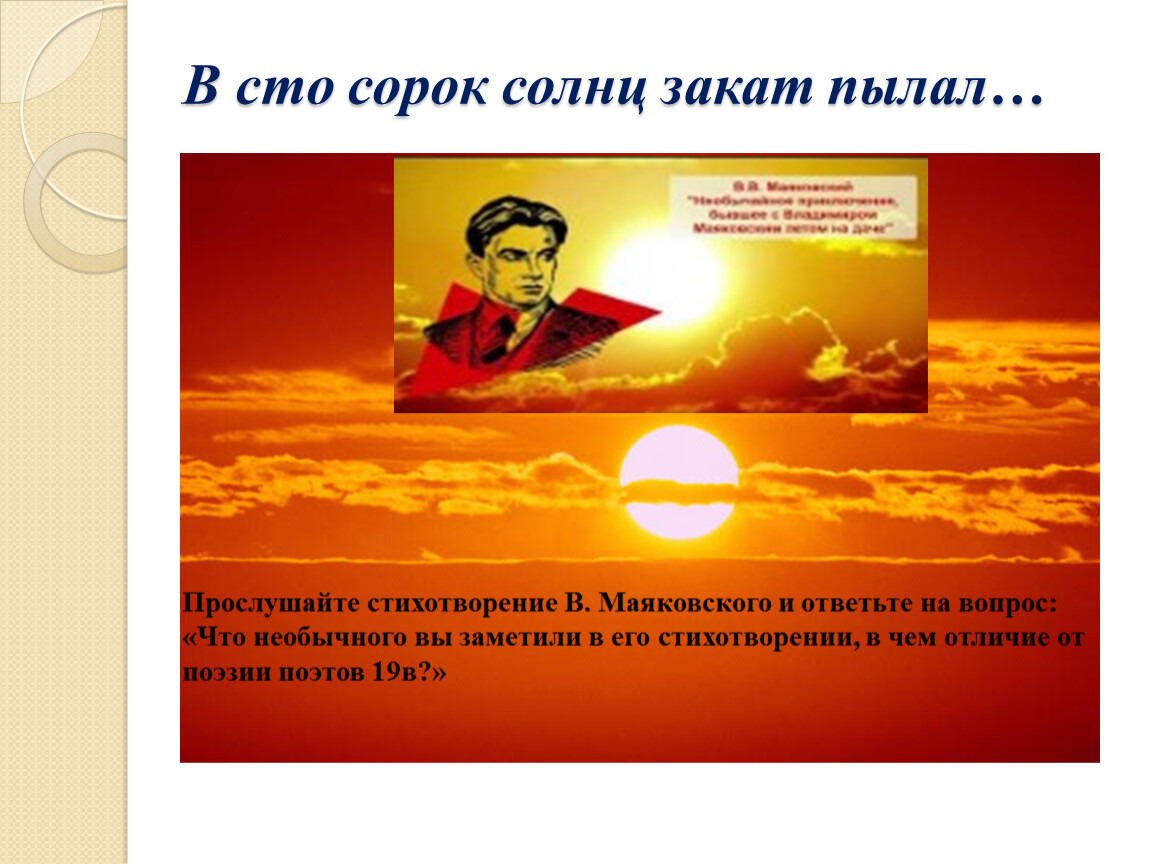 Прослушайте стихотворение В. Маяковского и ответьте на вопрос: «Что необычного вы заметили в его стихотворении, в чем отличие от поэзии поэтов 19в?»