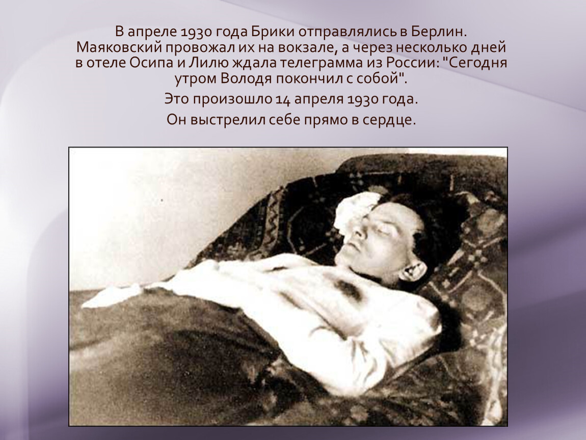 В апреле 1930 года Брики отправлялись в Берлин. Маяковский провожал их на вокзале, а через несколько дней в отеле Осипа и Лилю ждала телеграмма из России: "Сегодня утром Володя покончил с собой".