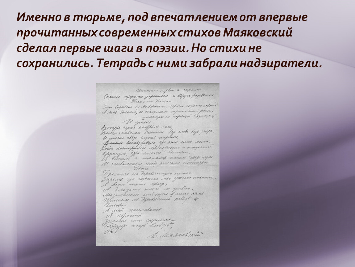 Именно в тюрьме, под впечатлением от впервые прочитанных современных стихов Маяковский сделал первые шаги в поэзии. Но стихи не сохранились. Тетрадь с ними забрали надзиратели.