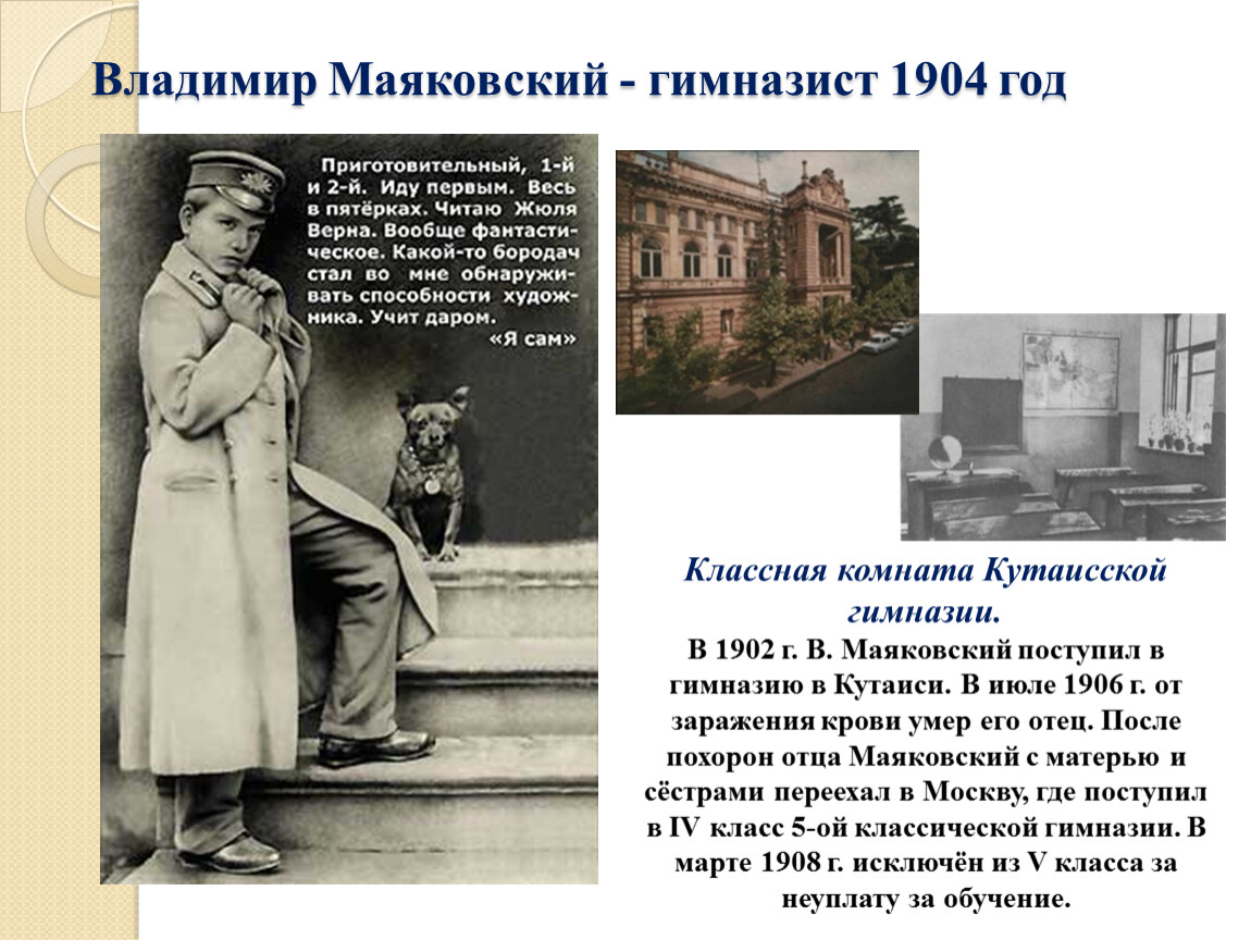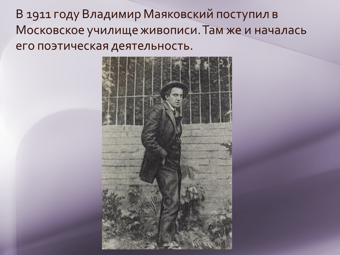 В 1911 году Владимир Маяковский поступил в Московское училище живописи. Там же и началась его поэтическая деятельность.