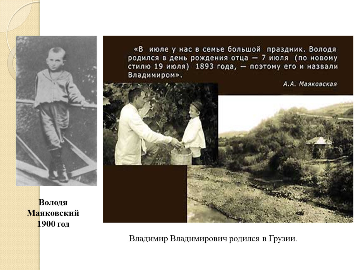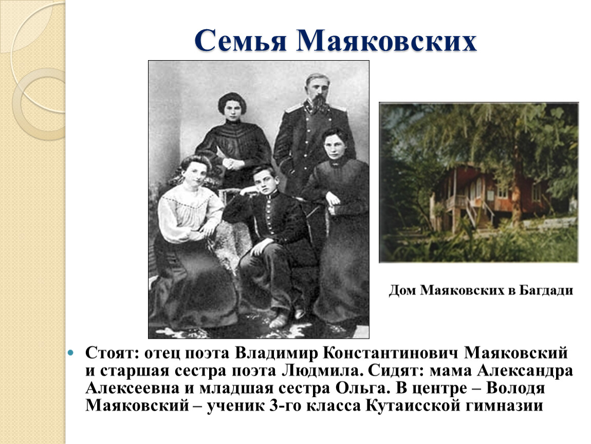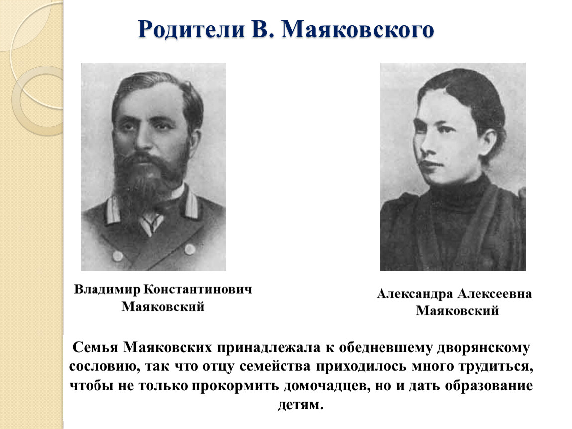 Семья Маяковских принадлежала к обедневшему дворянскому сословию, так что отцу семейства приходилось много трудиться, чтобы не только прокормить домочадцев, но и дать образование детям.