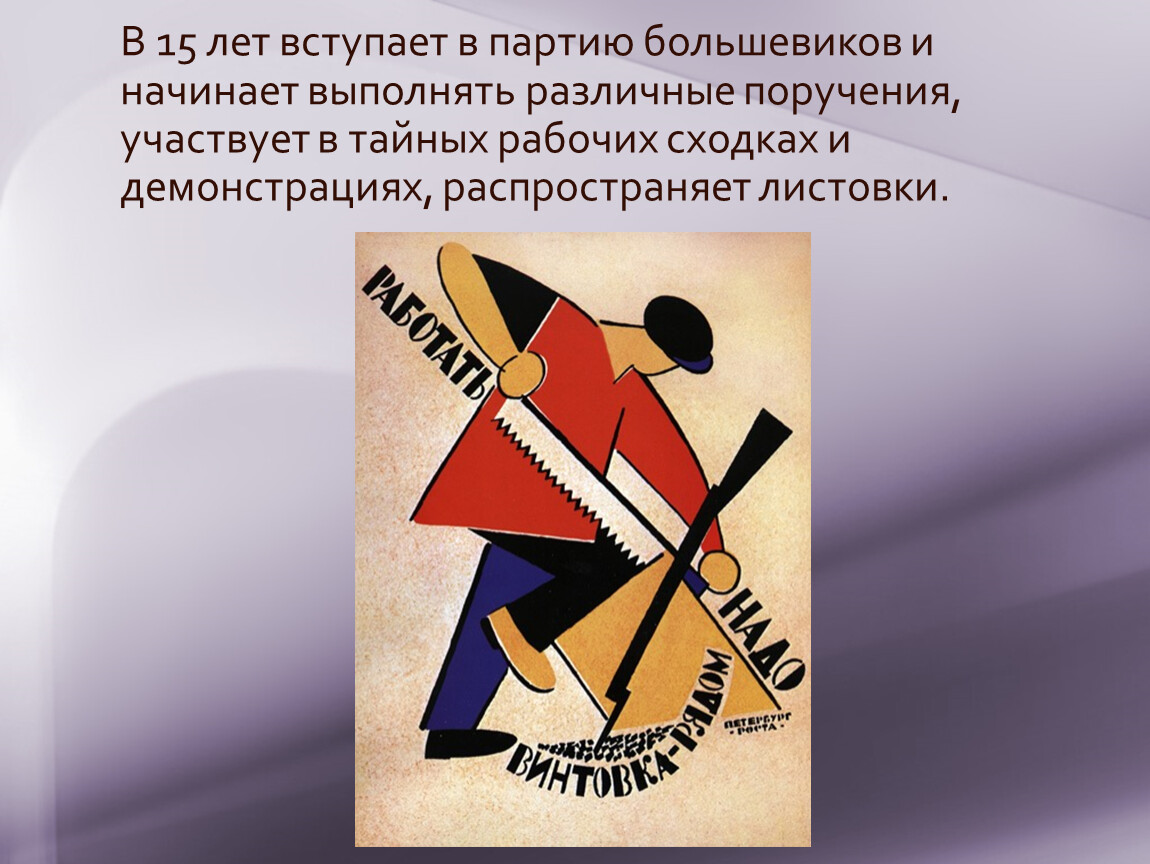 В 15 лет вступает в партию большевиков и начинает выполнять различные поручения, участвует в тайных рабочих сходках и демонстрациях, распространяет листовки.