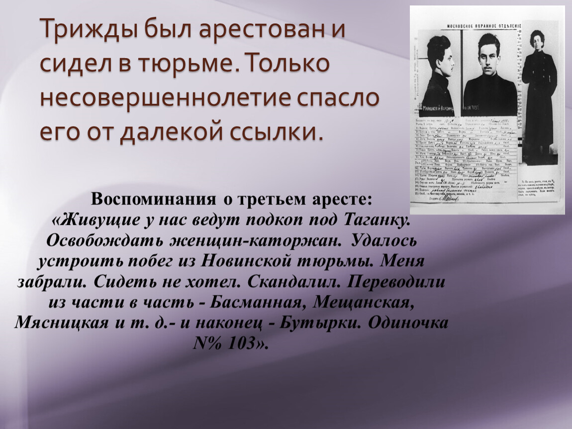 Трижды был арестован и сидел в тюрьме. Только несовершеннолетие спасло его от далекой ссылки.