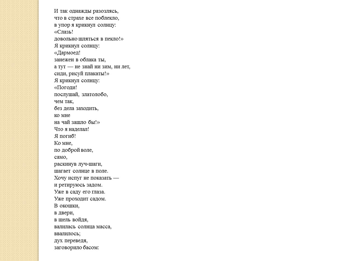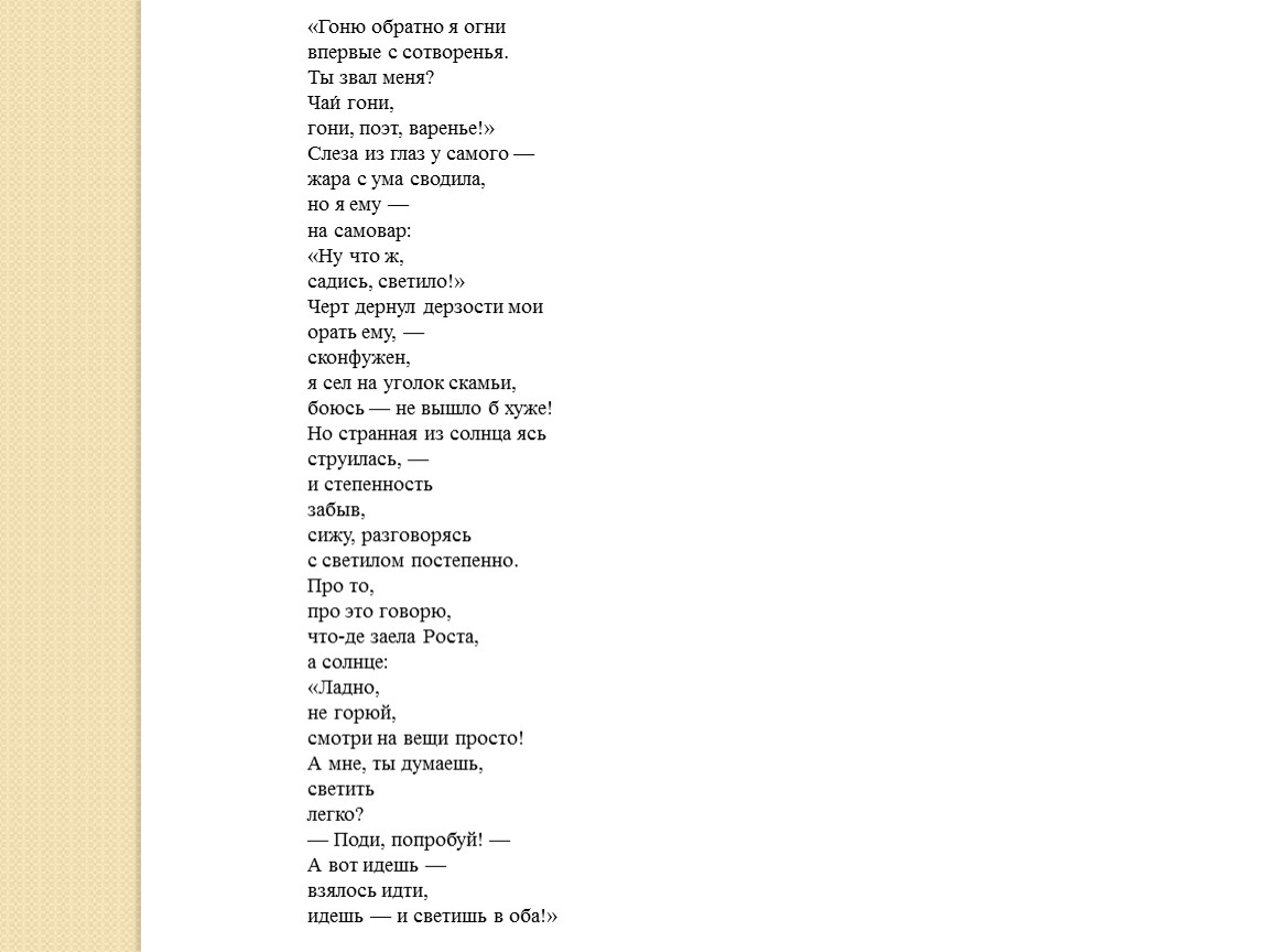 «Гоню обратно я огнивпервые с сотворенья.Ты звал меня?Чаи́ гони,гони, поэт, варенье!»Слеза из глаз у самого —жара с ума сводила,но я ему —на самовар:«Ну что ж,садись, светило!»Черт дернул дерзости моиорать ему, —сконфужен,я сел на уголок скамьи,боюсь — не вышло б хуже!Но странная из солнца ясьструилась, —и степенностьзабыв,сижу, разговорясьс светилом постепенно.Про то,про это говорю,что-де заела Роста,а солнце:«Ладно,не горюй,смотри на вещи просто!А мне, ты думаешь,светитьлегко?— Поди, попробуй! —А вот идешь —взялось идти,идешь — и светишь в оба!»