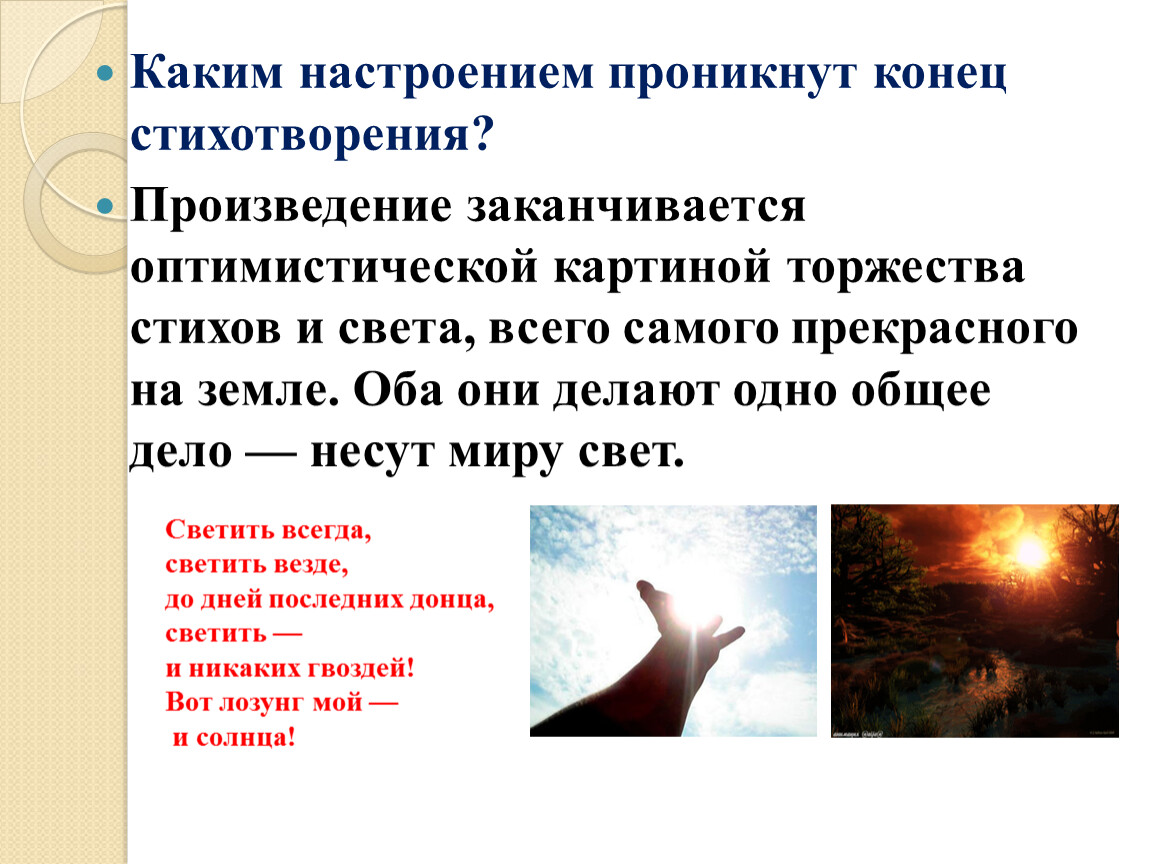 Произведение заканчивается оптимистической картиной торжества стихов и света, всего самого прекрасного на земле. Оба они делают одно общее дело — несут миру свет.