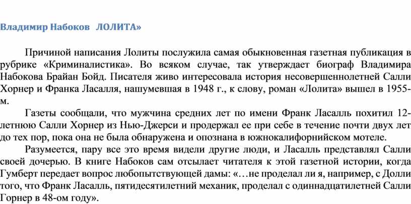 Причиной написания Лолиты послужила самая обыкновенная газетная публикация в рубрике «Криминалистика». Во всяком случае, так утверждает биограф Владимира Набокова Брайан Бойд. Писателя живо интересовала история несовершеннолетней Салли Хорнер и Франка Ласалля, нашумевшая в 1948 г., к слову, роман «Лолита» вышел в 1955-м.