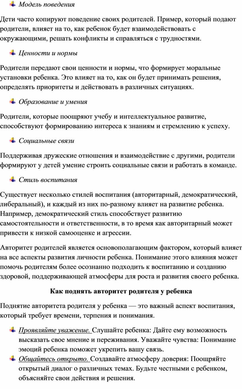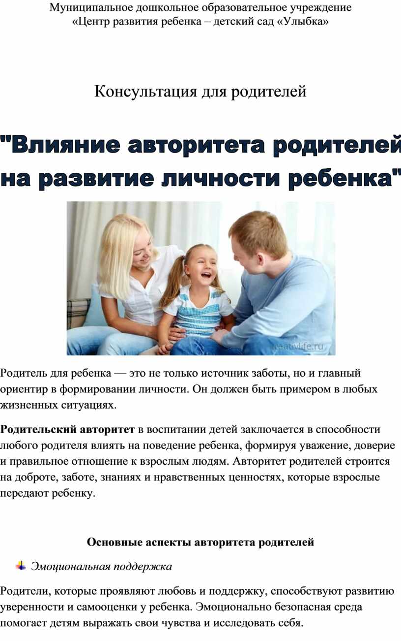 Авторитет родителей является основополагающим фактором, который влияет на все аспекты развития личности ребенка. Понимание этого влияния может помочь родителям более осознанно подходить к воспитанию и созданию здоровой, поддерживающей атмосферы для роста и развития своего ребенка.