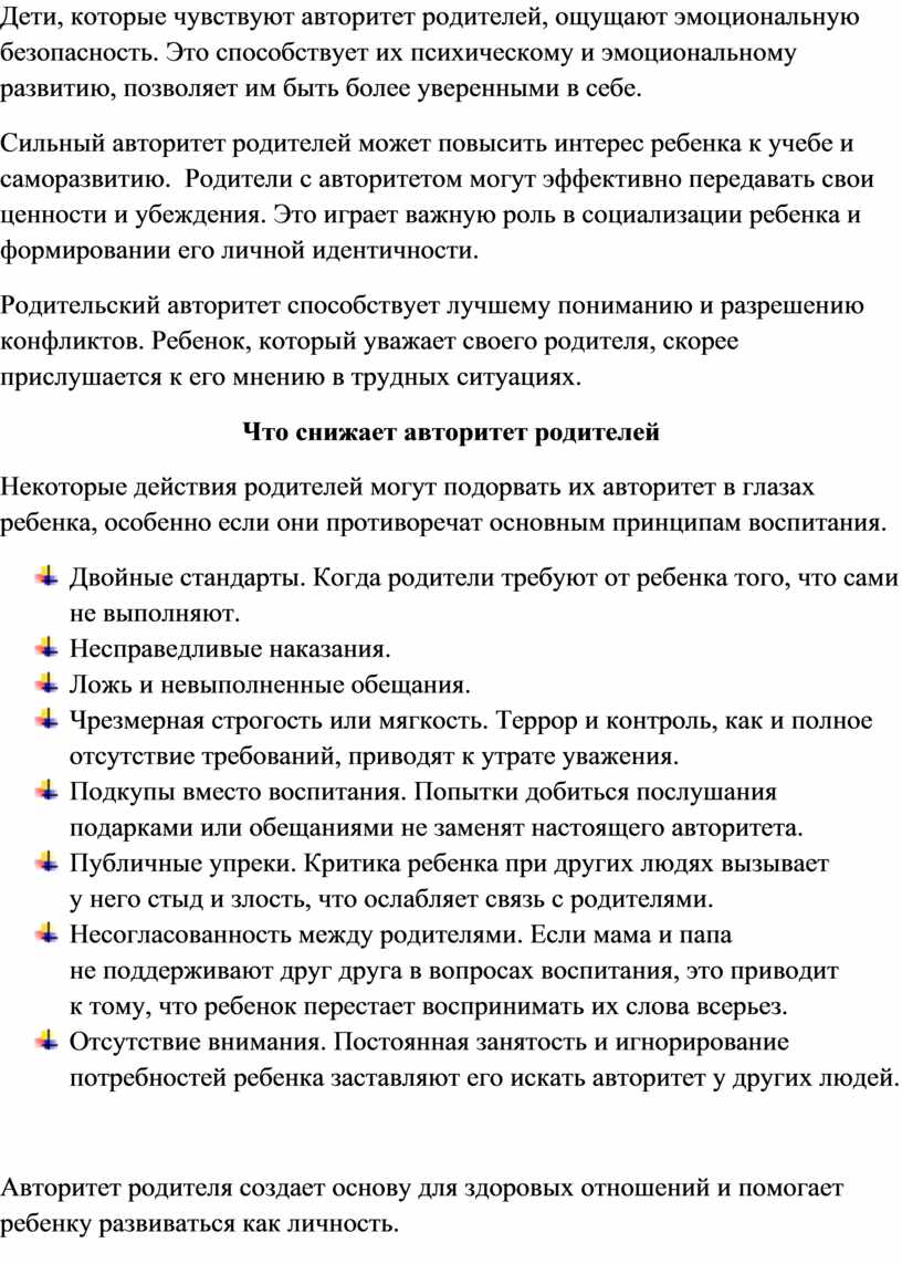 Родительский авторитет способствует лучшему пониманию и разрешению конфликтов. Ребенок, который уважает своего родителя, скорее прислушается к его мнению в трудных ситуациях.