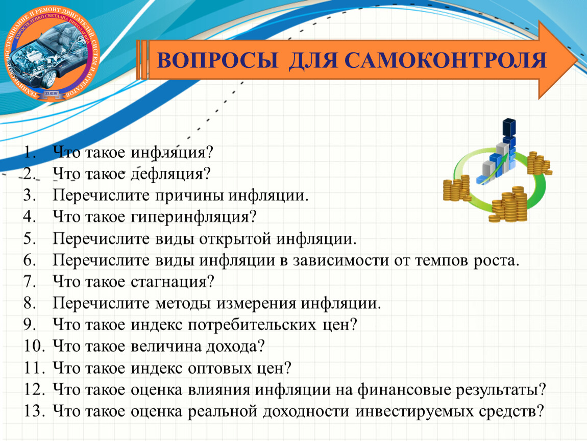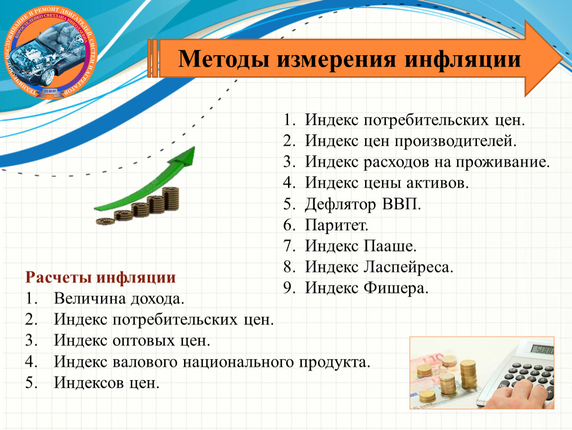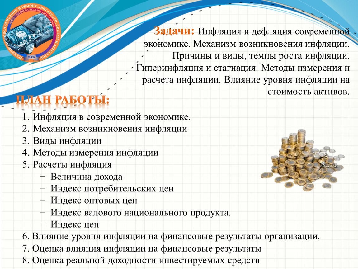 Задачи: Инфляция и дефляция современной экономике. Механизм возникновения инфляции. Причины и виды, темпы роста инфляции. Гиперинфляция и стагнация. Методы измерения и расчета инфляции. Влияние уровня инфляции на стоимость активов.