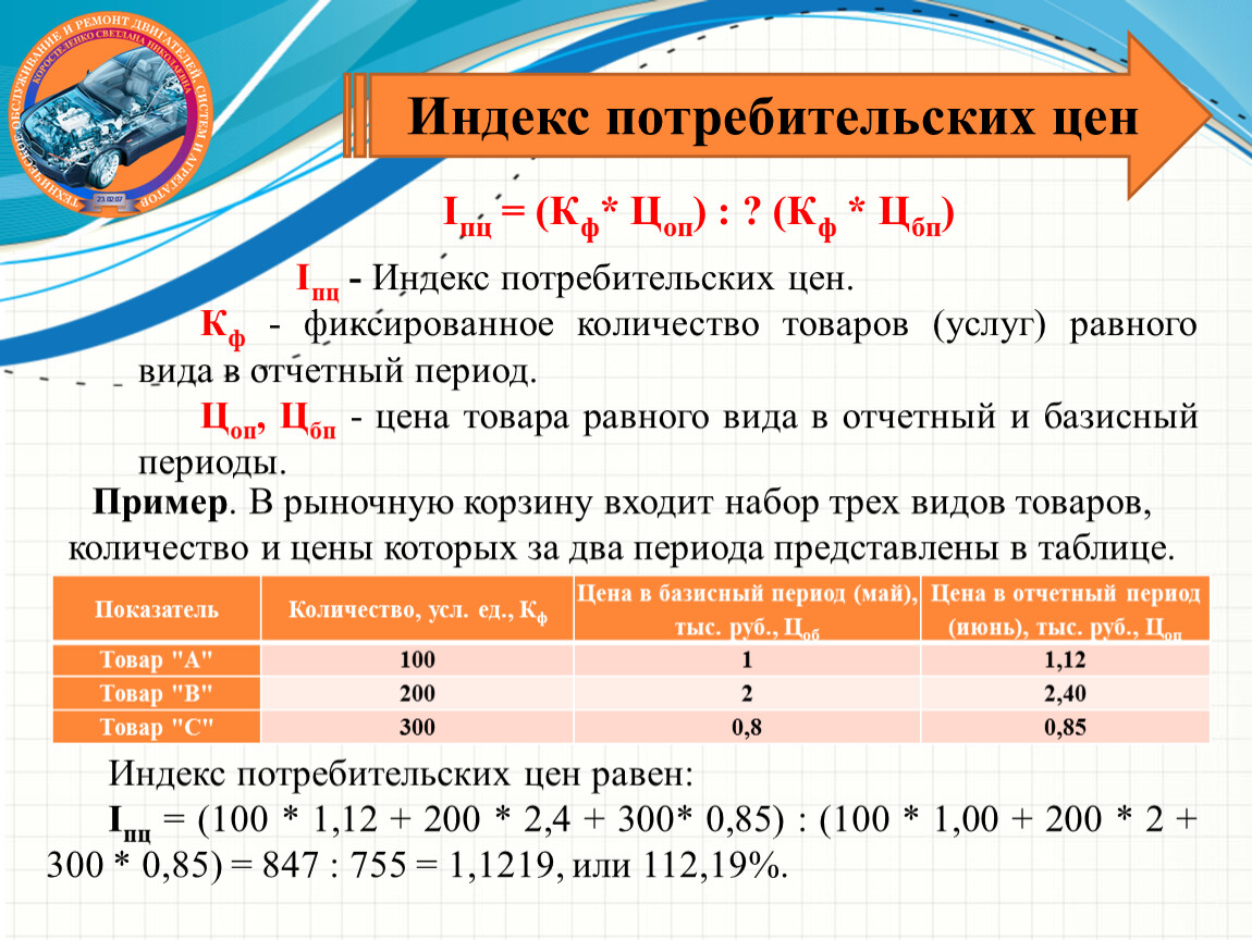 Iпц = (100 * 1,12 + 200 * 2,4 + 300* 0,85) : (100 * 1,00 + 200 * 2 + 300 * 0,85) = 847 : 755 = 1,1219, или 112,19%.
