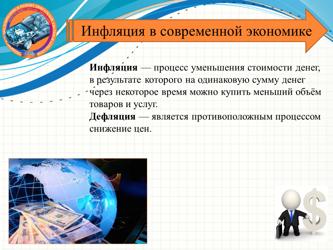 Инфляция — процесс уменьшения стоимости денег, в результате которого на одинаковую сумму денег через некоторое время можно купить меньший объём товаров и услуг.