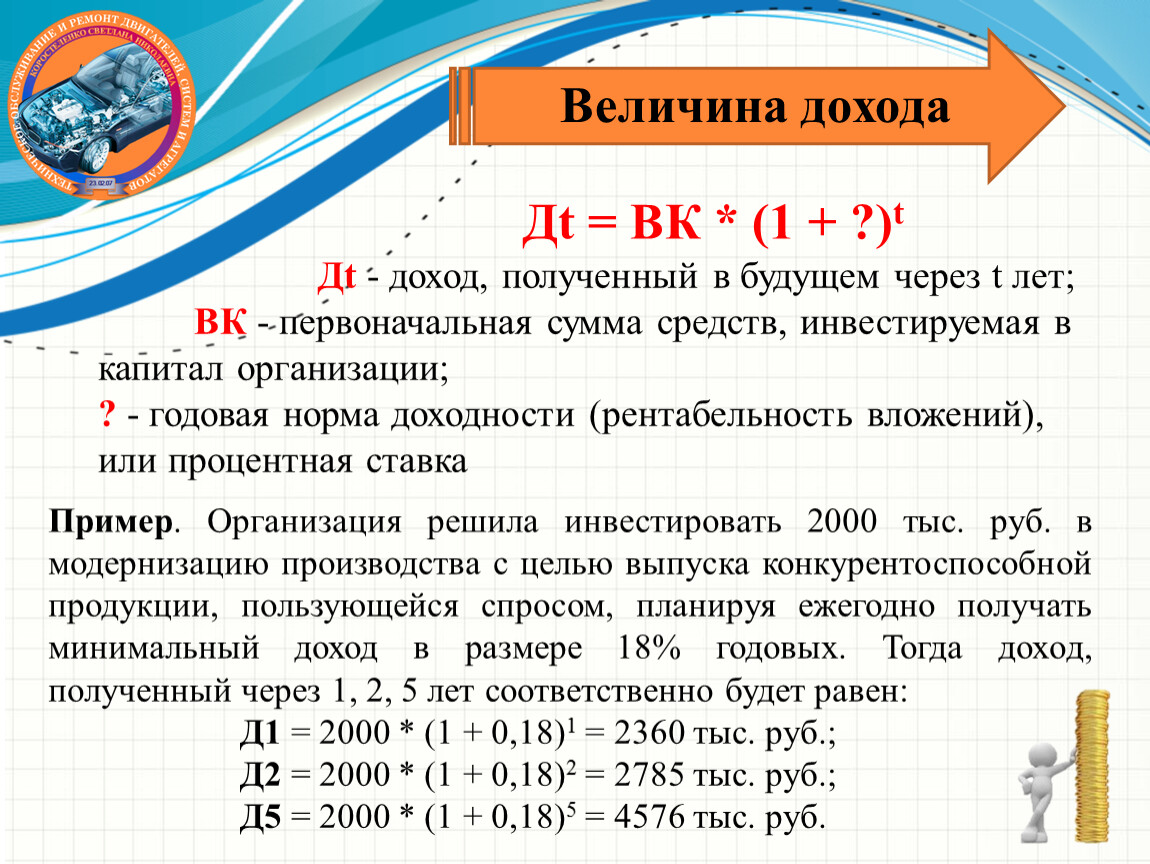 Пример. Организация решила инвестировать 2000 тыс. руб. в модернизацию производства с целью выпуска конкурентоспособной продукции, пользующейся спросом, планируя ежегодно получать минимальный доход в размере 18% годовых. Тогда доход, полученный через 1, 2, 5 лет соответственно будет равен: