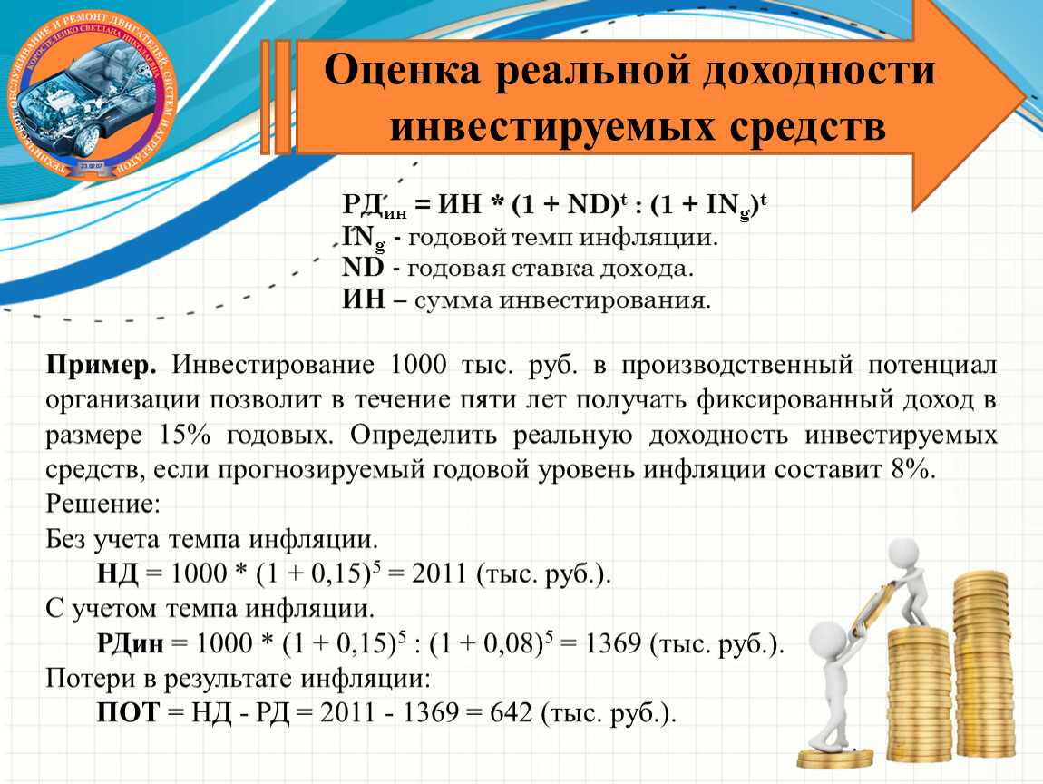 Пример. Инвестирование 1000 тыс. руб. в производственный потенциал организации позволит в течение пяти лет получать фиксированный доход в размере 15% годовых. Определить реальную доходность инвестируемых средств, если прогнозируемый годовой уровень инфляции составит 8%.
