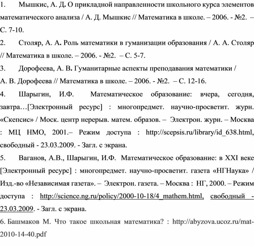 1. Мышкис, А. Д. О прикладной направленности школьного курса элементов математического анализа / А. Д. Мышкис // Математика в школе. – 2006. - №2. – С. 7-10.
