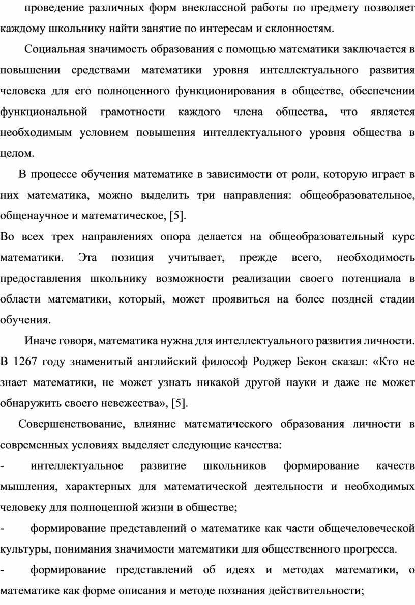 Иначе говоря, математика нужна для интеллектуального развития личности. В 1267 году знаменитый английский философ Роджер Бекон сказал: «Кто не знает математики, не может узнать никакой другой науки и даже не может обнаружить своего невежества», [5].